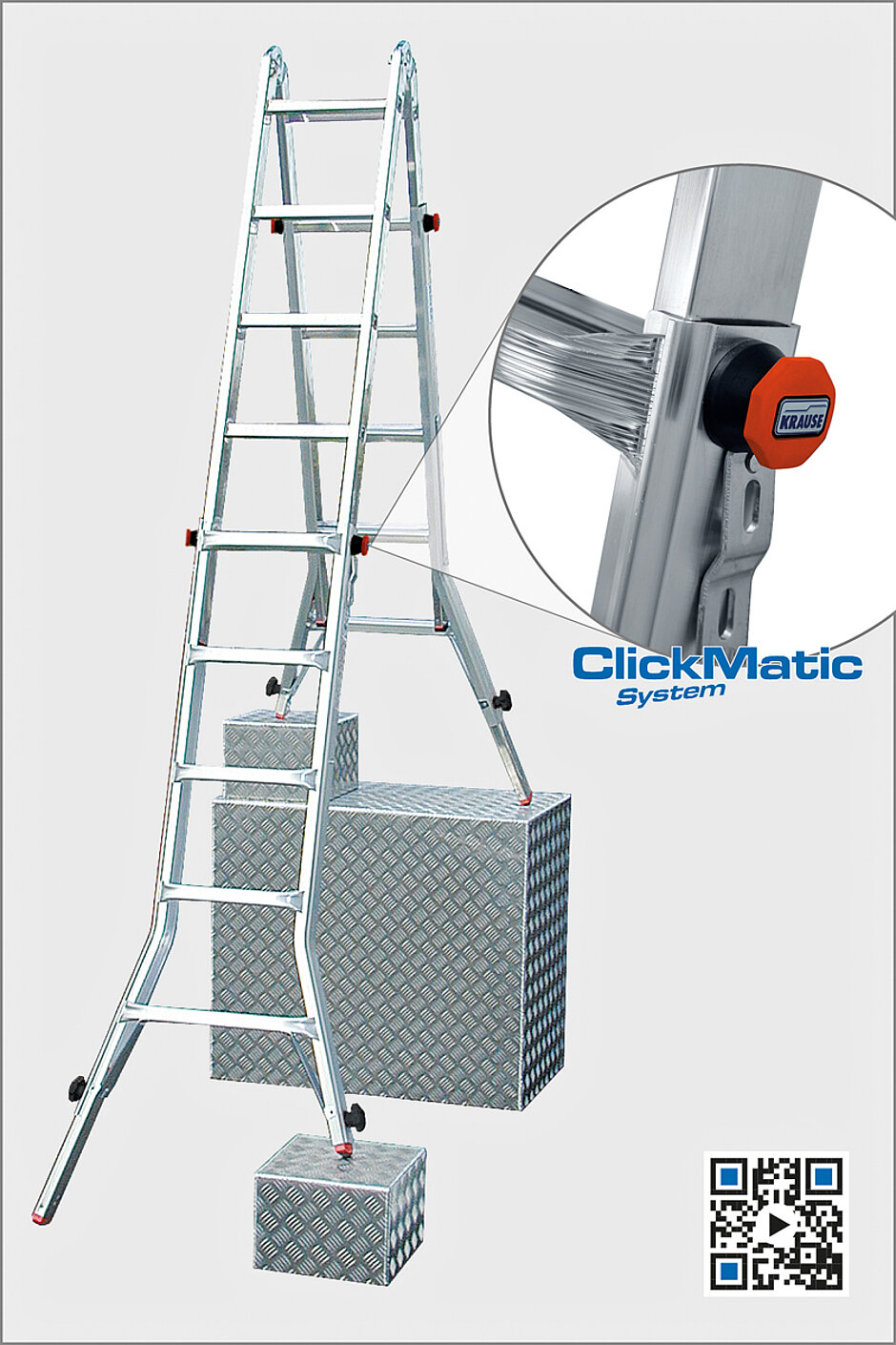Gelenk-Teleskopleitern sind aufgrund der integrierten Höhenverstellung gut für Arbeiten auf Treppen und Absätzen geeignet. Arbeitssicherheit und Effektivität stehen bei der Entwicklung aller Krause-Produkte an erster Stelle, heißt es in einer Mitteilung des Unternehmens. So sei die Anwendung des »ClickMatic-Systems« zur Höhenverstellung ergonomisch und einfach. Möchte man die Leiter entriegeln, zieht man beide Knöpfe an den Außenholmen heraus und dreht sie leicht im Uhrzeigersinn. Danach kann man die Leiter leicht auf die geforderte Höhe einstellen. Ist die gewünschte Position erreicht, führt man die Knöpfe in die entsprechende Sprosse zurück oder lässt sie automatisch einrasten. Nun sind die Holme verriegelt, ein ungewolltes Verschieben der Leiternteile ist nicht mehr möglich. Die so eingestellte Leiter verspricht eine sichere Anwendung in jeder Situation. Nach Gebrauch kann sie auf die gleiche Weise entriegelt und eingeschoben werden. J