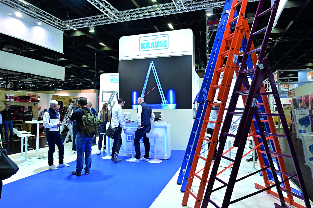 Der Messeauftritt wurde durch farbige Vielzweck- und Stehleitern als aufmerksamkeitsstarke Sortimentssignale, die Teleskop-Plattformleiter »SkyMatic« im Live-Handling sowie einem Stufentester, an dem die Unterschiede der Stufenvarianten direkt spürbar wurden, ergänzt.