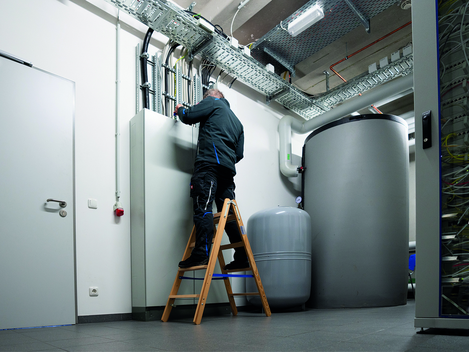Für diese gewerblichen Anwender ist besonders die Stufen/Sprossen-Doppelleiter interessant. Alle Ebenen, die betreten werden dürfen, sind bei dieser Leiter mit rutschhemmenden Stufen ausgestattet, die auch bei längeren Tätigkeiten einen ermüdungsfreien Stand ermöglichen. Die oberen beiden Ebenen, die laut Norm nicht betreten werden dürfen, sind mit Sprossen ausgestattet und dienen zur Stabilisierung des Standes in Bockstellung der Leiter.