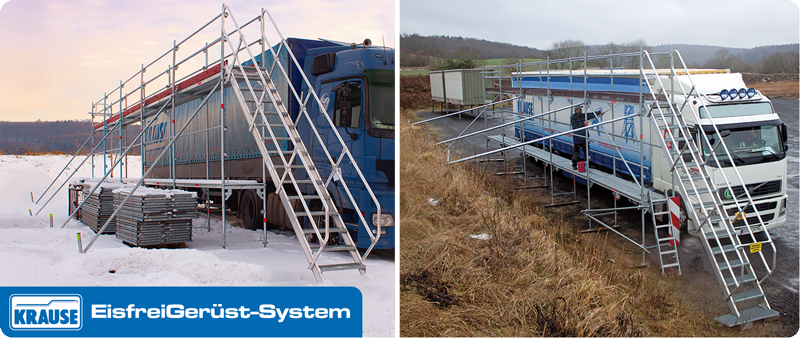 Bei entsprechend widrigen Wetterbedingungen ist der sichere Zugang zu Fahrzeugdächern besonders wichtig. Der rutschsichere Treppenaufgang aus Stahl-Gitterroststufen ermöglicht dem Nutzer einen schnellen und sicheren Zugang auf die Arbeitsplattform, um die Dachfläche zu reinigen. Stahlloch-Beläge sowie der dreiteilige Seitenschutz bieten die Voraussetzung, um bei jedem Wetter sicher und komfortabel zu arbeiten. Stufenlos nivellierbare Spindelfüße ermöglichen es, das EisfreiGerüst-System selbst auf unebenen Untergründen standsicher zu verwenden. Mit der optional erhältlichen Stahlplatte als Unterlage für Vertikalrahmen und Treppenaufgang erreicht man zusätzliche Stabilität. Ergänzende Erweiterungen und Zubehör machen das Original-KRAUSE-EisfreiGerüst zum idealen Arbeitsgerät für jede Anforderung. Beispielsweise kann die untere, zweite Plattform mit dem Geländer-Erweiterungsset als weitere Lauffläche genutzt werden. Egal ob auf Autohöfen, in Werkstätten oder in Betriebshöfen, das System des Traditionsherstellers ist immer öfter im Einsatz. Ein integriertes Schrankenset mit Warntafel verhindert das unbefugte Betreten. Das TÜV-geprüfte Gerüst ist individuell in 3 m Schritten in der Länge erweiterbar und kann so flexibel an jeden LKW und jedes Nutzfahrzeug angepasst werden. Als weiteres Zubehör wird ein praktischer Eisräumer angeboten. Er zertrümmert mit seinen Hart-PVC-Köpfen Eisplatten und ermöglicht dank des extralangen Stiels sowie der Gummilippe das einfache Entfernen von Schnee und Eis. Dieser kann mit der perfekt abgestimmten Halterung direkt am Gerüst befestigt werden und ist somit immer an Ort und Stelle verfügbar.
