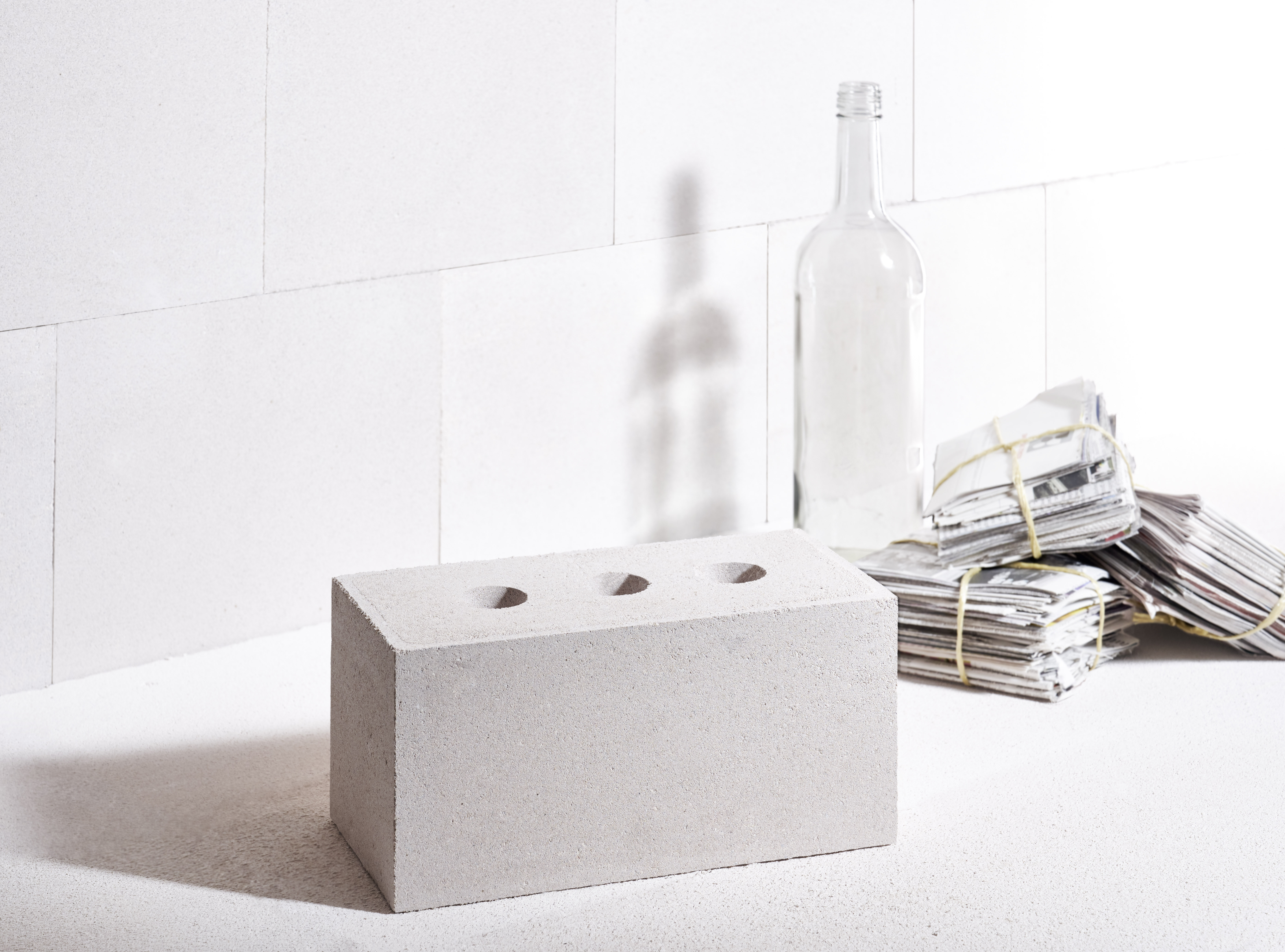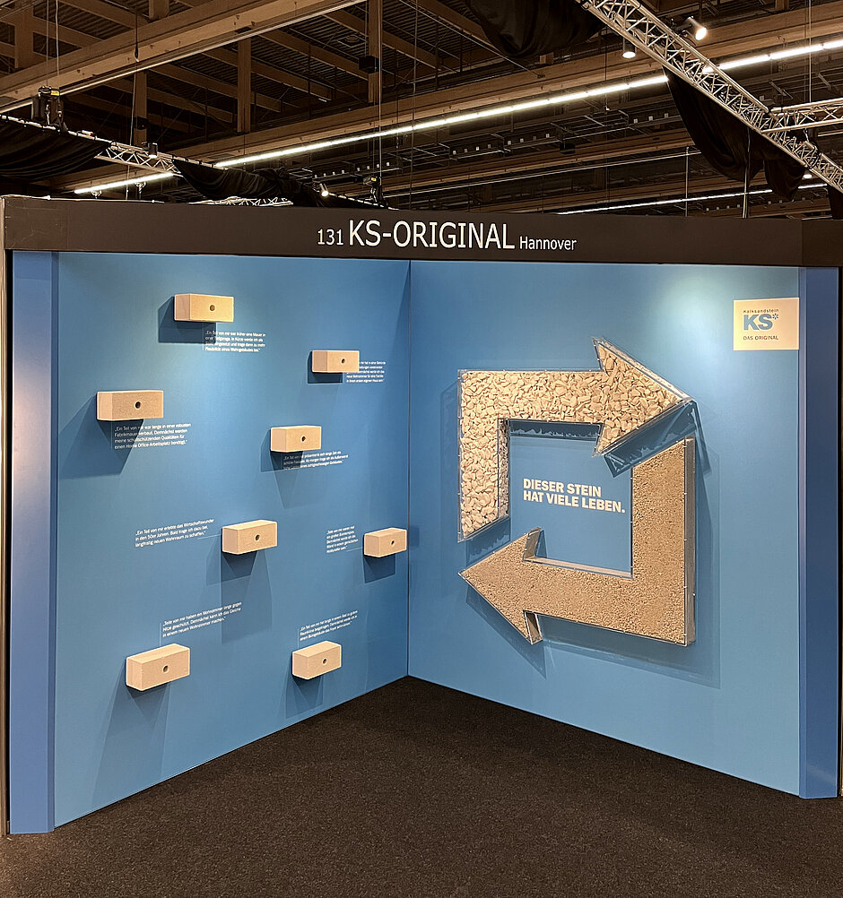 In seinem Ausstellungsbereich präsentierte KS-Original den Besuchern der kuratierten Messe den KS-Kreislaufstein, der äußerlich nicht auf eine Innovation schließen lässt. Denn aufgrund des neuen Verfahrens können die mit Brechwerken zerkleinerten Kalksandsteine mit dem herkömmlichen Gemenge aus Sand, Kalk und Wasser vermischt und in den energiearmen Produktionsprozess gegeben werden. Hierbei könne es sich um sortenreines Material aus dem Rückbau von Bestandsgebäuden oder Reststoffe aus der eigenen Produktion handeln – der Anteil liege derzeit bei 10 bis 15 Prozent. Der KS-Kreislaufstein benötige zur Herstellung keinen veränderten Fertigungsablauf und sei in allen relevanten Eigenschaften identisch zum klassisch produzierten Kalksandstein.