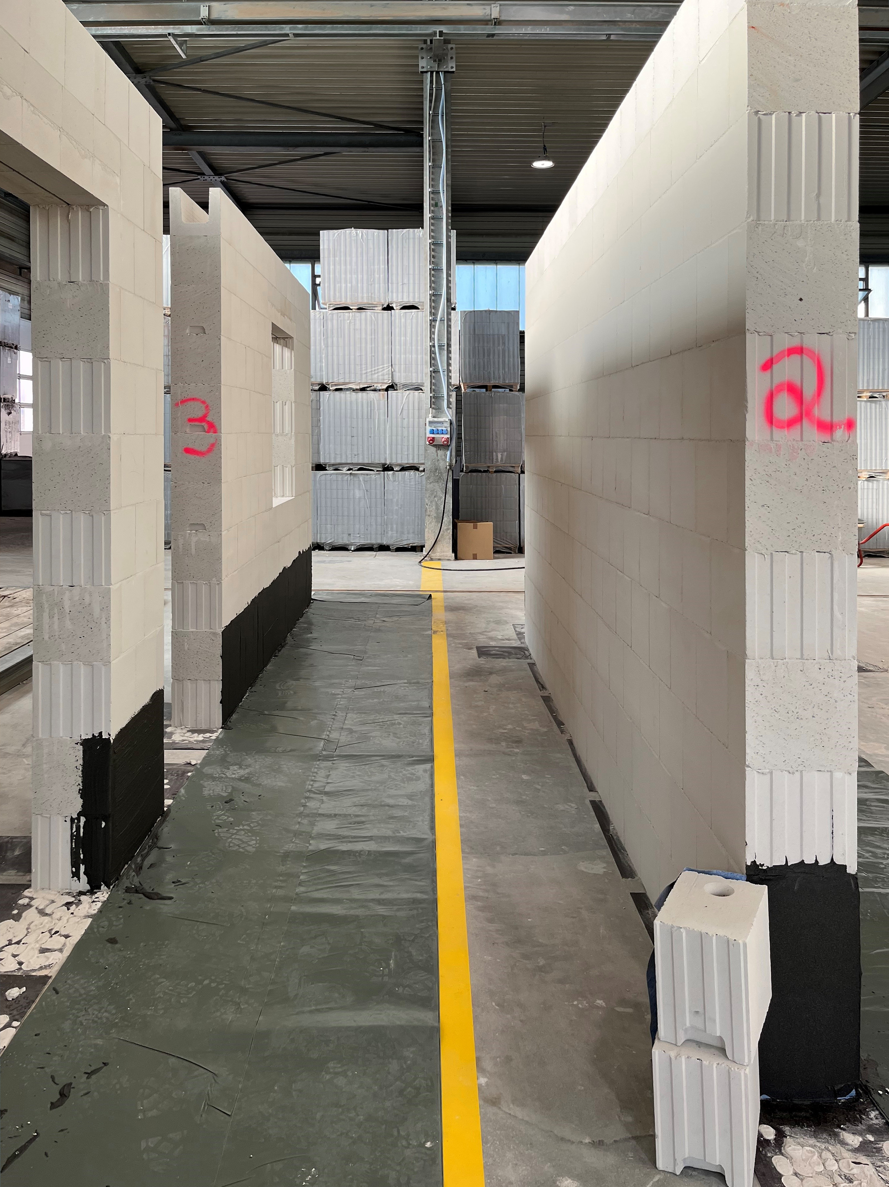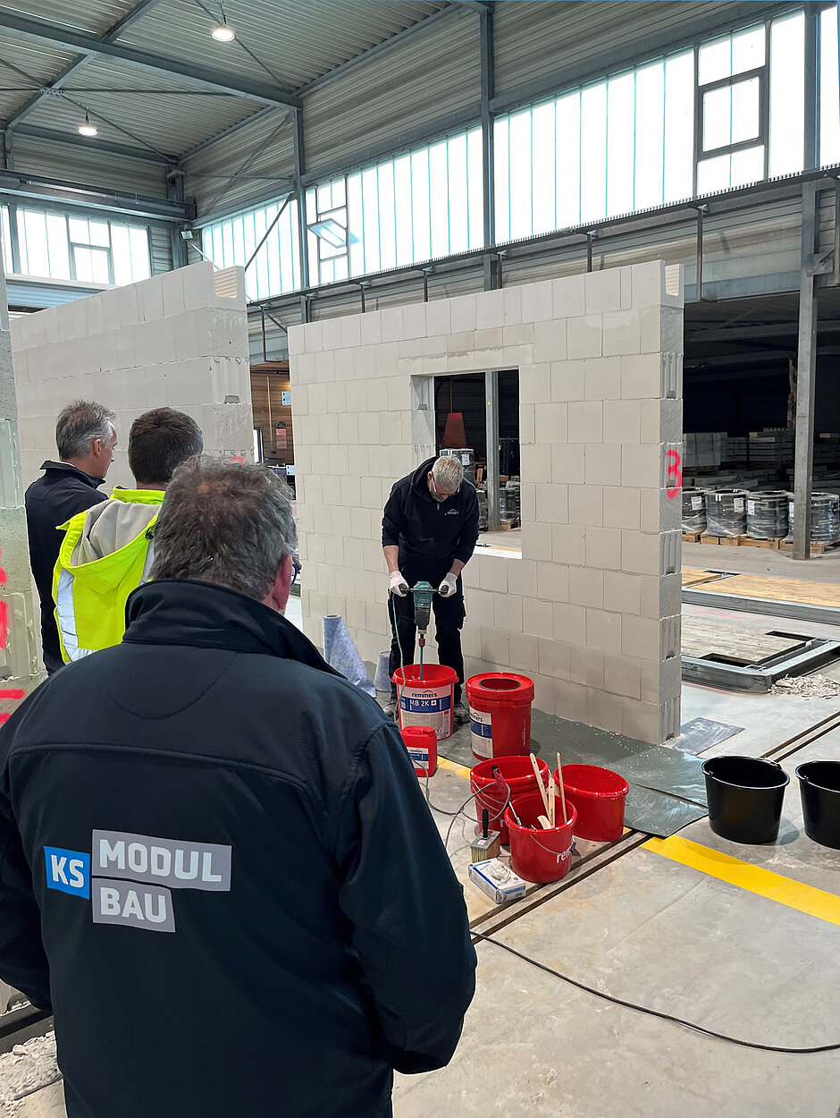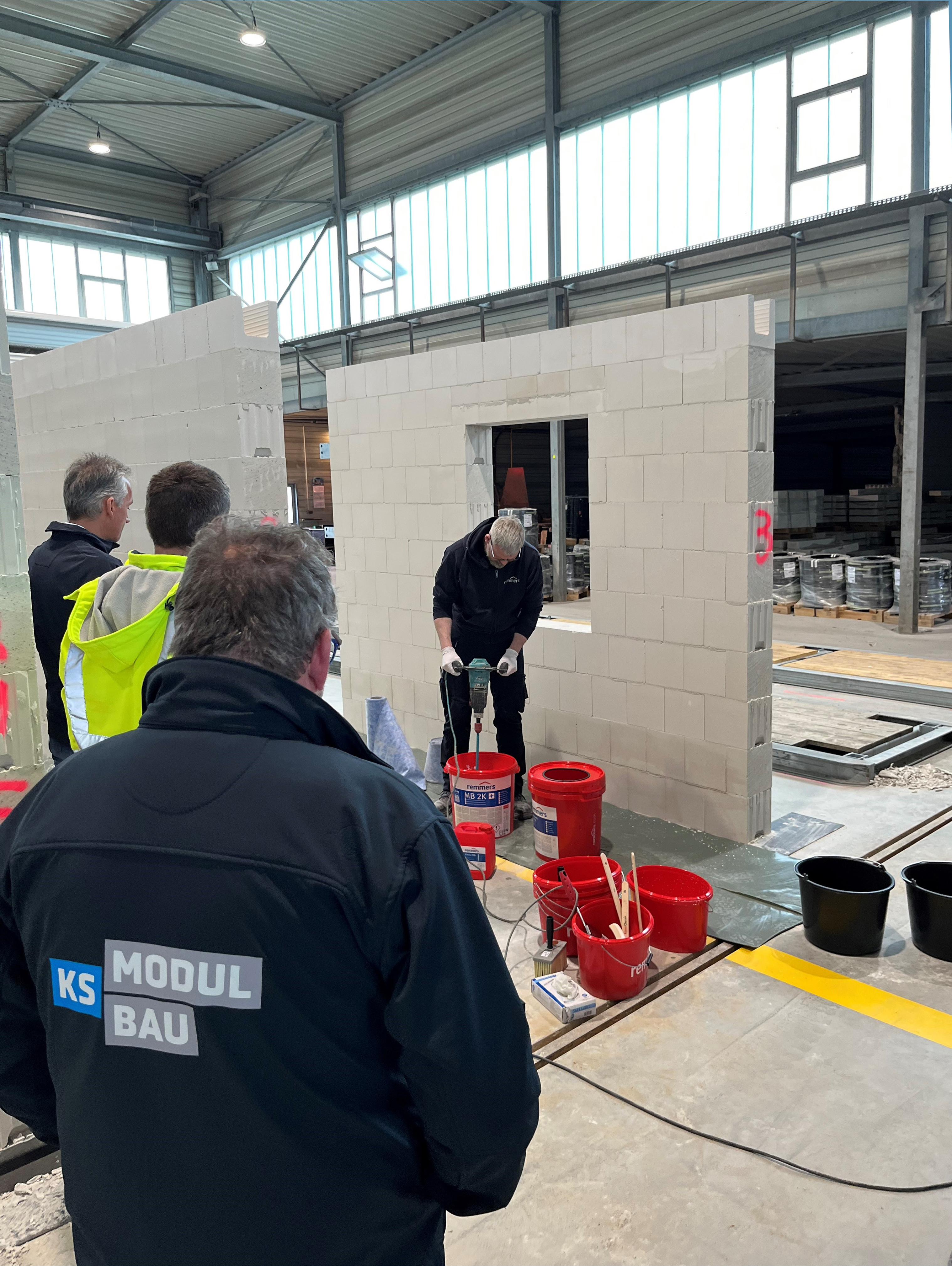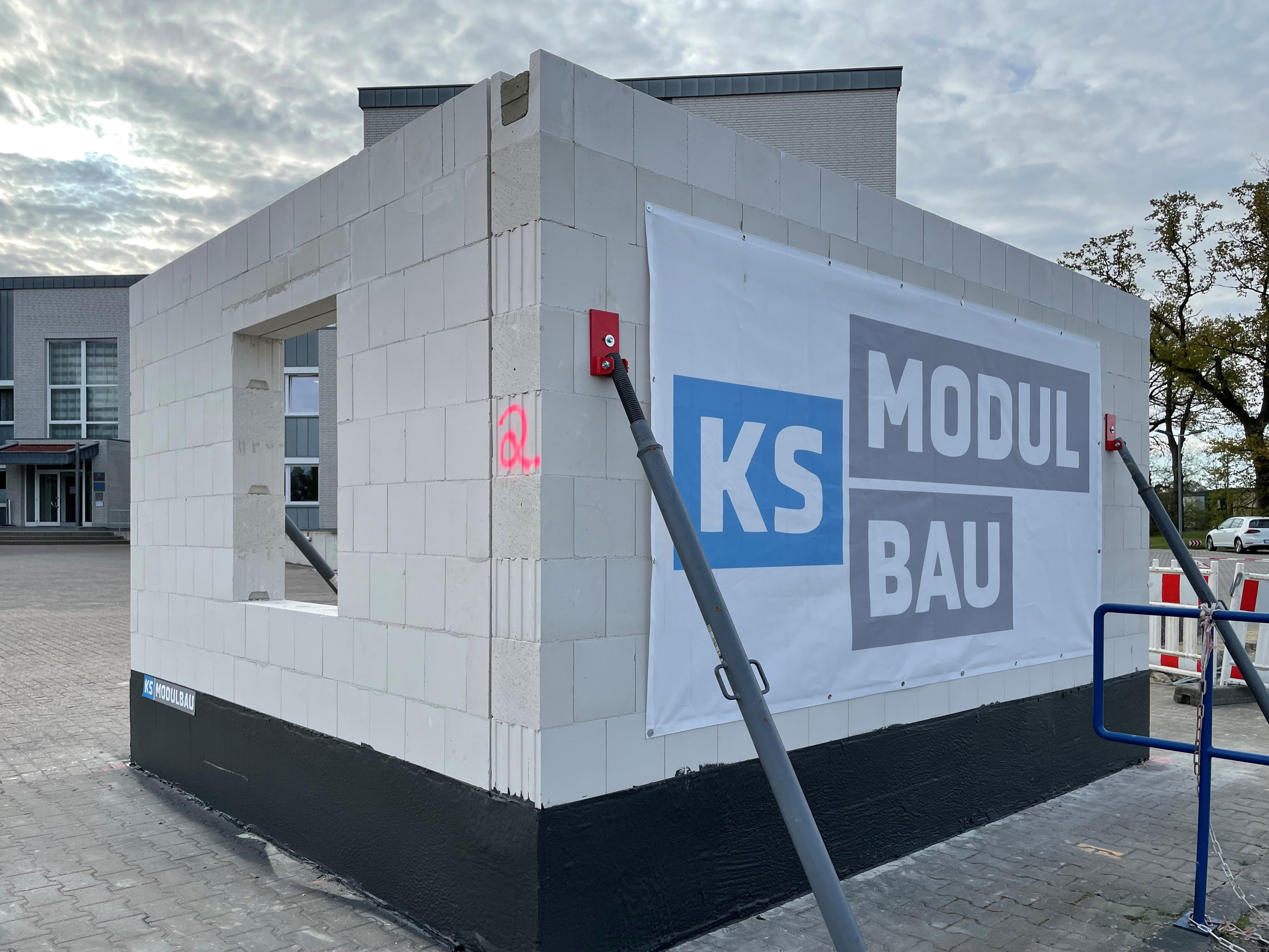 Die Modulbauwände aus KS-Plansteinen oder XL-Formaten werden im Werk Kastendiek, das zu den regionalen Produktionsbetrieben des Markenverbunds KS-Original gehört, in einem halbautomatisierten Prozess mit industrieller Maßgenauigkeit angefertigt. Die Wandelemente erfordern kein Standardmaß, sondern können einschließlich Fenster- und Türausschnitten in Größen bis zu 3,60 m Höhe und 6,00 m Breite individuell geplant werden. Ebenso sind sie in den BIM-Prozess integrierbar. Auf der Baustelle erfolge das Aufstellen etwa fünfzehn Mal so schnell wie die Errichtung mit herkömmlichen XL-Formaten und bedürfe keines Spezialwerkzeugs. Sebastian Schumacher, Geschäftsführer der KS-Modulbau, erklärt: „Mit der Sockelabdichtung lässt sich jetzt ein weiterer Schritt in die Produktion verlagern. Das beschleunigt die Arbeit auf der Baustelle und ermöglicht die Abdichtung in einem kontrollierten Prozess unter optimalen Bedingungen.“