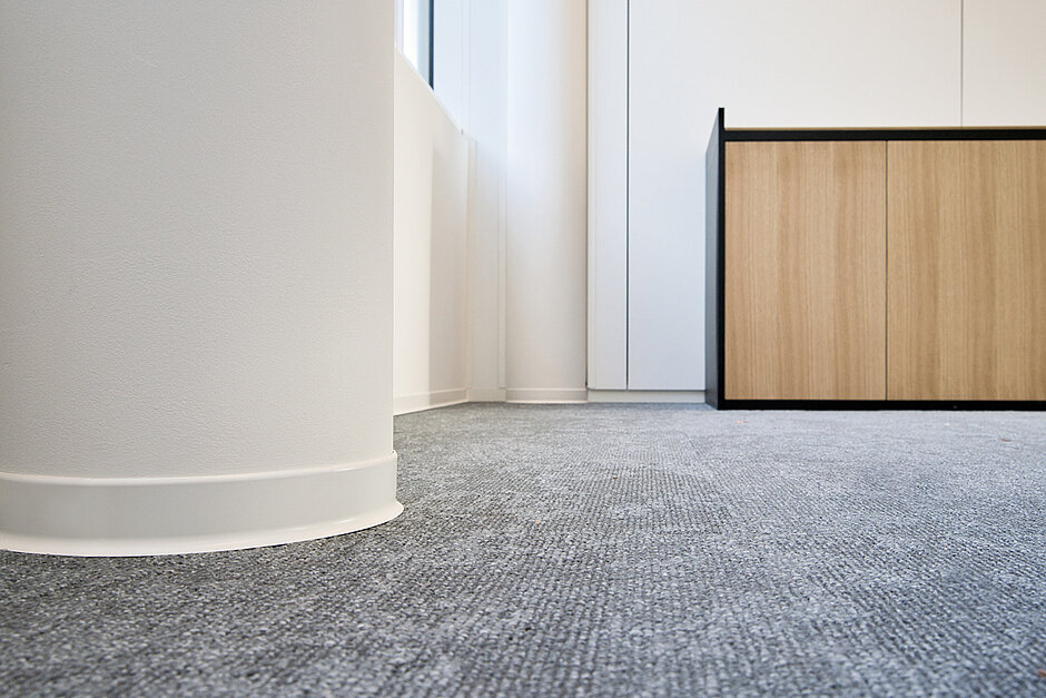 Das beschauliche Namur ist die Hauptstadt der belgischen Region Wallonie mit Sitz der Regierung sowie des Parlaments. Der Neubau für die Abgeordneten schafft trotz seiner modernen, geradlinigen Architektur eine gelungene Verbindung zu den historischen Gebäuden ringsherum. Auf 3 744 m² bietet er allen 75 wallonischen Abgeordneten sowie den politischen Fraktionen zweckmäßig eingerichtete Arbeitsbereiche. Die nach Außen gezeigte Sachlichkeit hat das Architekten-Team in den Innenbereichen mit 260 zierlichen Säulen und Halbsäulen optisch aufgelockert. Zudem schaffen weiße Aluminium-Sockelleisten einen fließenden und gleichzeitig sehr strapazierfähigen Übergang von der Wand zum Boden. Auf den ersten Blick nichts Außergewöhnliches. Doch bei der Suche nach den passenden Leisten stellte sich heraus, dass die Kombination der geforderten Produkteigenschaften durchaus eine Herausforderung für Hersteller ist: Denn passend zu den RAL 9010 weißen Alu-Sockelleisten sahen die Pläne Säulenringe und -halbringe mit einem Durchmesser von nur 30 cm vor. Nach längerer Suche fand man schließlich beim Profile-Spezialist Küberit eine smarte Lösung, die auch kurzfristig in hoher Qualität und in der erforderlichen Menge gefertigt werden konnte.