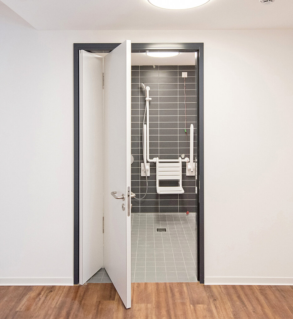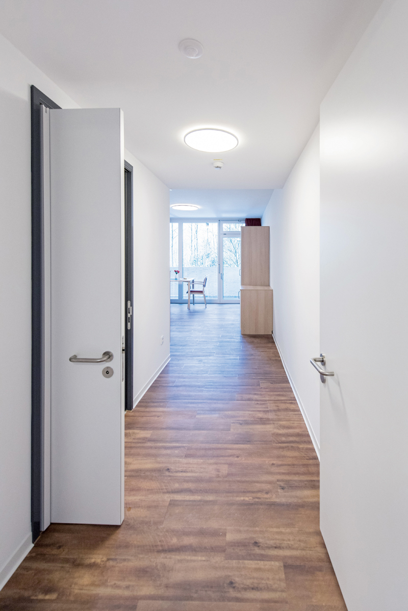 Die großzügige Raumplanung in den Bädern mit einem erforderlichen lichten Türdurchgang von 900 mm, unter Berücksichtigung der Drückergarnitur, erforderte den Einsatz von platzsparenden Raumspartüren, um den Durchgang in das Bewohnerzimmer nicht zu begrenzen. Trotz der großen Türbreite ragen die Türblätter nur zu einem Drittel der Breite in den Flur. Sie lassen sich dadurch auch mit Rollator oder Rollstuhl barrierefrei passieren.