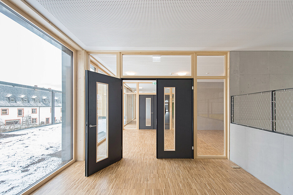 Passend zur individuellen Raumgestaltung mit Schrankwänden und Festverglasung kamen in dem neuen Kinderhaus die Fingerschutztüren mit unterschiedlichen Zargenformen zum Einsatz – sowohl Umfassungs- als auch Profilzargen in Kombination mit Massivholzzargen sowie Holz-Glaswänden. Einzelne Türen hat der Hersteller zusätzlich mit integrierten Türschließern und Freilauffunktion ausgestattet, die im Falle von Rauch und Feuer automatisch dicht schließen. Zudem wurden Türen mit Schallschutzfunktion zur Abgrenzung lärmintensiver Räume von Ruheräumen eingebaut, die mit Werten von Rw,P 42 dB punkten. J
