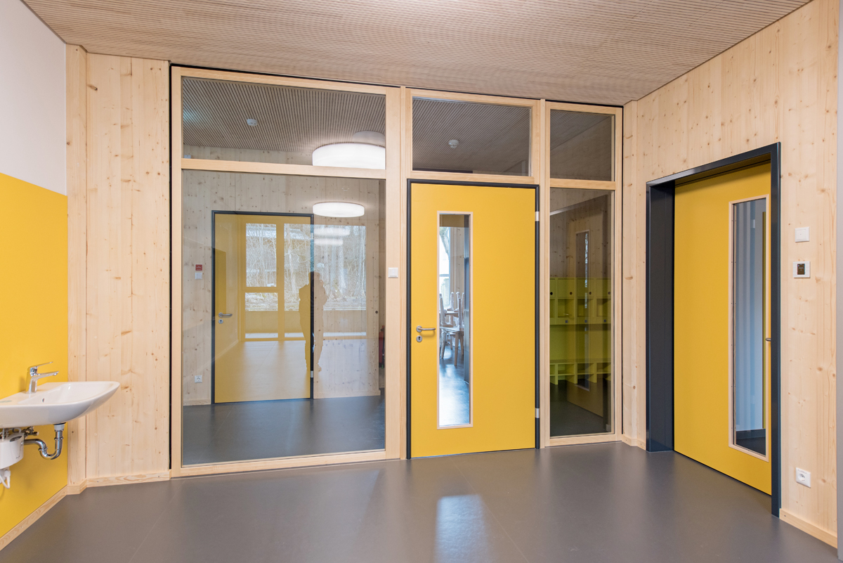 Küffner lieferte ein- und zweiflügelige Türen, zum Teil raumhoch mit Oberblenden und kombiniert mit umlaufenden Festverglasungen aus Holzrahmenprofilen. Die Türblätter mit HPL-Oberflächen und passenden 2 mm-ABS-Kanten nehmen das Farbkonzept, das die Orientierung erleichtert, auf. Um die funktionalen Anforderungen gemäß der gültigen Kindertagesstättenverordnung zur Vermeidung von Verletzungen umzusetzen, entschieden sich die Planer für spezielle Fingerschutztüren von Küffner. In diese hat der Hersteller nachgebende Knautschzonen auf der Band- und der Schlosskante integriert. Die abgerundete Geometrie der Fingerschutzzarge vermeidet im Zusammenspiel mit dem Bandsystem gefährliche Scherstellungen beim Öffnen und Schließen der Tür, was besonders Kinderfinger vor Verletzungen schützt.