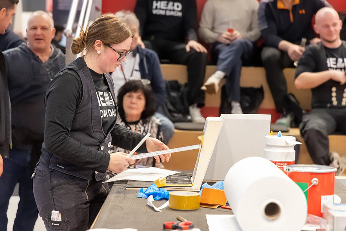Für Gänsehautmomente sorgte das große Finale der »Mission: Flachdach 2.0« direkt am Messestand. Aus einer dreistelligen Zahl an Bewerbungen wurden 20 Nachwuchstalente ausgelost, die sich in Köln live dem Urteil einer Fachjury stellten. Unter den wachsamen Augen von Tobias Tröger (Lamilux Academy), Paul Heil (Dachdeckermeister und Deutschlands bester Dachdecker 2019) sowie André Hauft (Ausbilder und Dozent am BBZ Mayen) ging es um Präzision, Sauberkeit, Dichtheit und Tempo beim fachgerechten Eindichten eines Aufsatzkranzes mit Flüssigkunststoff. Konzentrierte Blicke, routinierte Handgriffe und spürbare Anspannung sorgten dabei für eine Atmosphäre, die zahlreiche Messebesucher beim Vorbeigehen innehalten ließ.