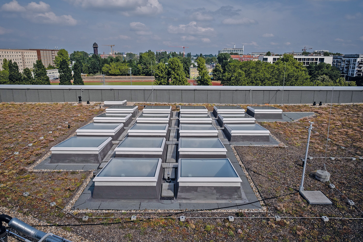 Die von innen sichtbare Holzkonstruktion unterstützt das bemerkenswerte Tageslicht-Erscheinungsbild der Flachdach- fenster: »Für den Neubau der Modersohn Grundschule haben wir im Januar 2021 insgesamt 18 Flachdachfenster, 16 davon in Stegbauweise, geliefert. Als Stegbauweise bezeichnen wir die enge Aneinanderreihung von Oberlichtern mit Aufsatzkränzen, um so eine Glasdach-Optik zu erzeugen. Durch die Holzunterkonstruktion, welche von der Firma Brauer Baugesellschaft aus Berlin hergestellt, geliefert und montiert wurde, konnten die einzelnen Elemente dann zu einem ›Glasdach‹ verbaut werden«, erklärt Tobias Käppel, Vertrieb Tageslichtelemente bei Lamilux. Übernommen wurde der Einbau der Flachdachfenster von der Berliner Firma Universum Dachbau: »Nachdem wir die Dampfsperre aufgebracht hatten, um das Dach vor eindringender Feuchtigkeit und Wasser zu schützen, wurde die Holzunterkonstruktion eingesetzt, bevor wir, in enger Absprache mit Lamilux, die Oberlichter eingebaut haben«, erklärt Andreas Unversucht, Geschäftsführer Universum Dachbau. Und weiter: »Eine große Herausforderung war dabei die Gefälledämmung zwischen den Flachdachfenster, um stehendes Wasser zu vermeiden.«