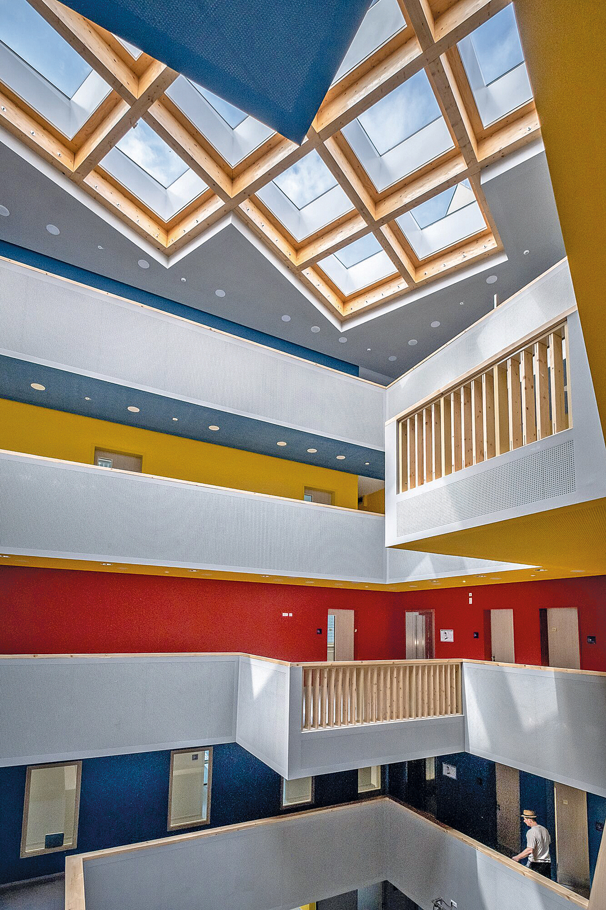 »Tageslicht ist besser als Kunstlicht!« Das ist die kurze, aber auf den Punkt gebrachte Antwort der projektleitenden Architektin Karin Willke von Numrich Albrecht Klumpp Architekten, Berlin, auf die Frage, weshalb sie besonders in schulischen Einrichtungen Tageslichtsysteme einsetzt: »Durch die hohe Anzahl der Lamilux Flachdachfenster ›F100‹ konnten wir, besonders im Gebäude-Mittelpunkt, für einen sehr guten Tageslichteinfall sorgen.« So wurde ein gesundes Raumklima geschaffen, welches sich laut Lamilux positiv auf die Konzentrationsspanne von Kindern auswirkt und somit zu höheren Lernerfolgen und einer erleichterten Kommunikation der Schülerinnen und Schüler führt.