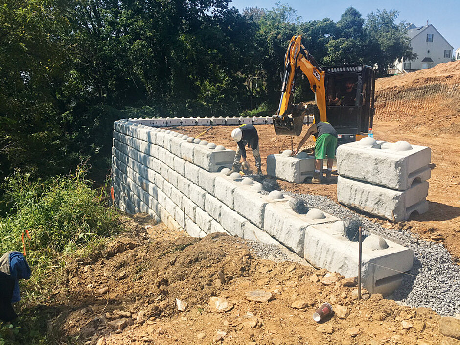 Doch »Redi Rock« bietet zahlreiche weitere Vorteile – besonders in Sachen Montage. Für das ausgeklügelte System von Mauthe ist kein Betonfundament erforderlich und auch kein Verkleben. Der Aufbau ist denkbar einfach, sicher und schnell. Bis zu einer Aufbauhöhe von vier Metern genügt eine Planie aus Schottermaterial. Nötig ist lediglich ein Aushub bis auf den tragenden Untergrund sowie eine Verdichtung dieses Untergrunds. Im Anschluss muss die Drainage nach Planvorgabe erstellt sowie Grobschotter eingebracht und nivelliert werden.