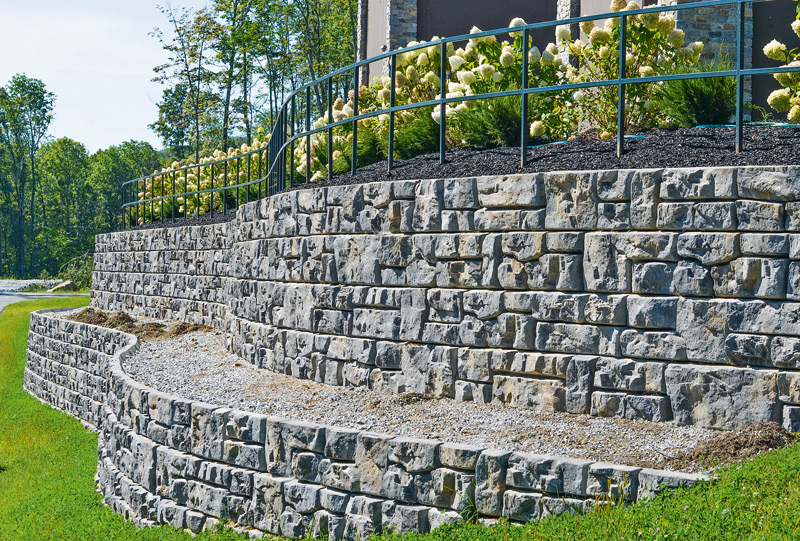 Einen weiteren Pluspunkt erhält »Redi Rock« in Sachen Design. Das System ist in zwei Oberflächenstrukturen – Felsstein- und Blocksteinstruktur – und auf Wunsch auch in verschiedenen Farben erhältlich. Komplettiert wird das Angebot durch Säulen, Stufen und Abdeckungen.