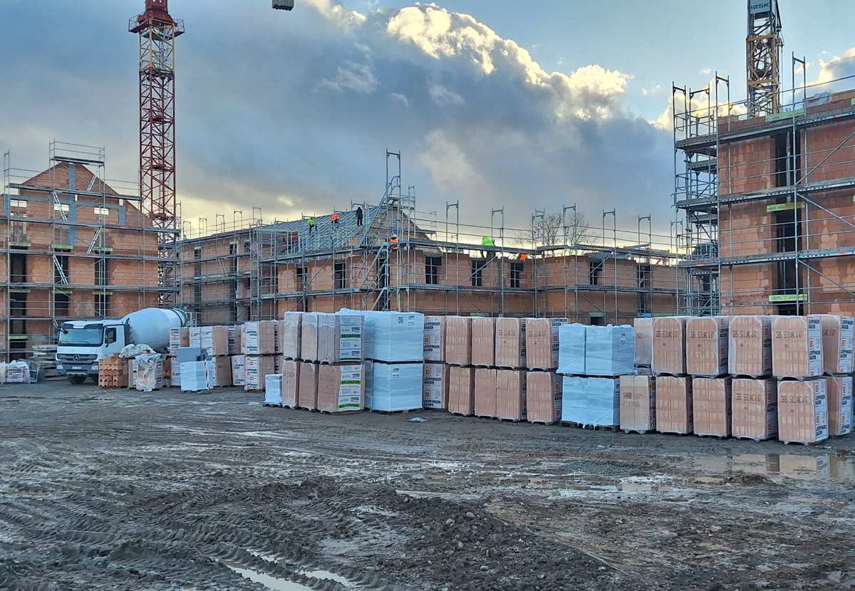 Die Wohnanlage konnte schneller als geplant fertiggestellt werden. Dies gelang auch durch den Einsatz des wasseraktivierbaren Mörtelpads von Maxit, das Leipfinger-Bader ebenfalls lieferte. Dieses besteht aus Trockenmörtel, einem wasserlöslichen Schmelzkleber und einem Glasfasergewebe, das der Trockenmörtelplatte zusätzliche Stabilität verleiht. Die Pads werden auf der Baustelle zunächst nach Bedarf zugeschnitten und bewässert, dann werden die Ziegel vollflächig aufgelegt und wie gewohnt festgeklopft. Auch durch den Verzicht auf zusätzliches Arbeitsgerät entsteht ein spürbarer Zeitvorteil bei der Vor- und Nachbereitung des Mauervorgangs, während gleichzeitig die Staubentwicklung beim Anrühren von Trockenmörtel reduziert wird und eine hohe Sauberkeit auf der Baustelle gewährleistet bleibt. Überzeugend ist auch die Logistik: Maxit-Mörtelpads können einfach eingelagert und andernorts wiederverwendet werden. Damit entsteht auf der Baustelle deutlich weniger Ausschuss. Dies spart Zeit und Personal bei gleicher Leistung.