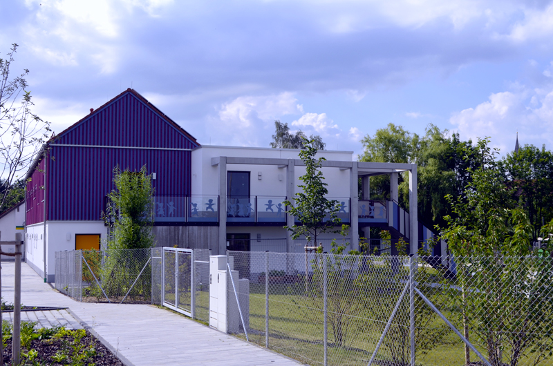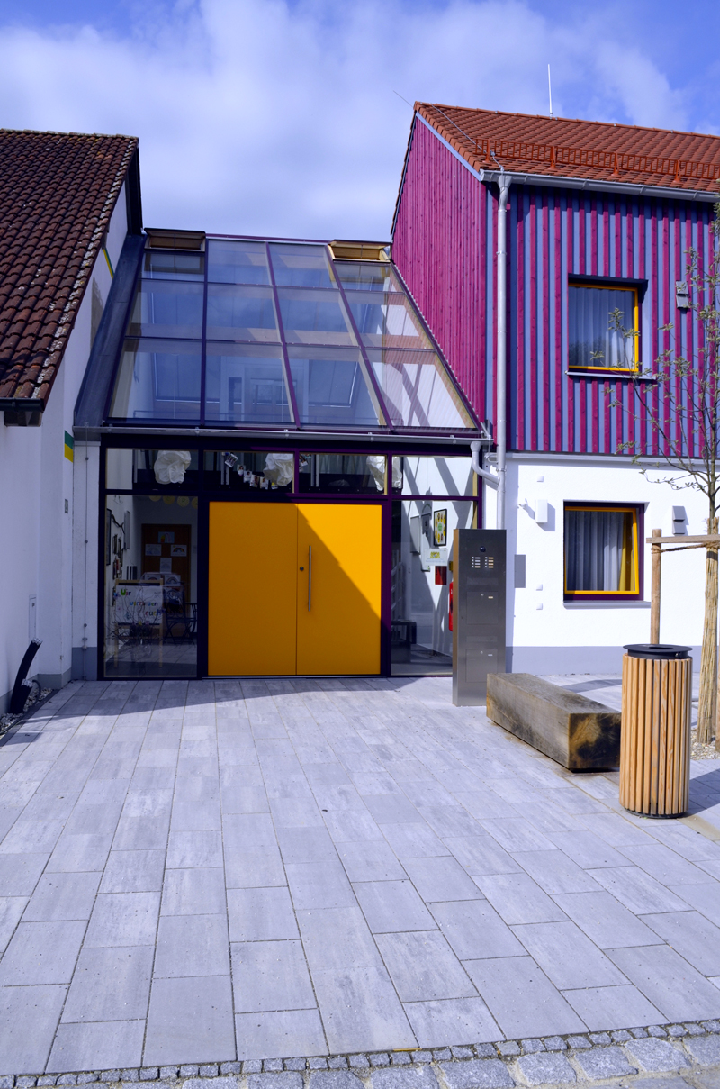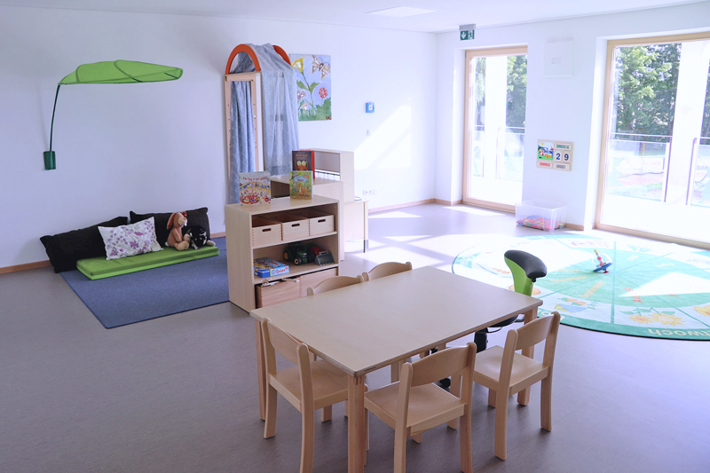 Bürgermeister Josef Reff und die Arbeiterwohlfahrt als Betreiber des Kindergartens waren bei der Eröffnung auch mit der durchdachten Raumaufteilung zufrieden. So orientieren sich alle Gruppen- sowie deren Nebenräume mit jeweils direktem Ausgang zur Gartenseite. Anderweitig genutzte Bereiche sind hingegen zur nördlichen Straßenseite angeordnet und schirmen vom Straßenlärm ab. Dank der weitläufigen Außenflächen ließ sich im Garten auch ein großzügiger Spielplatz mit zahlreichen Spielgeräten realisieren.