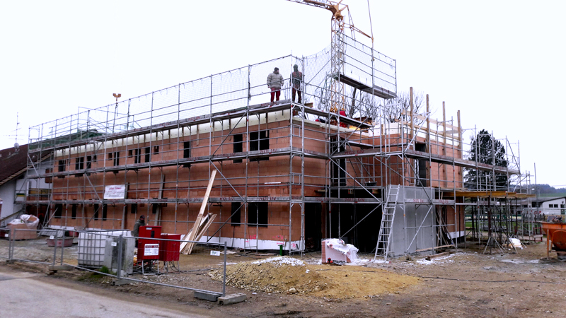 Trotz der teilweise winterlichen Witterungsverhältnisse der im Oktober 2018 begonnenen Baumaßnahmen, konnte der Rohbau zügig durchgeführt werden. Dabei erwies sich die hohe Verarbeitungsfreundlichkeit des Unipor W07 Silvacor als sehr hilfreich. Er ließ sich ohne Stoßfugenvermörtelung zügig in Dünnbettmörtel verlegen und trotz Holzfaserfüllung unproblematisch zuschneiden oder anbohren. Aufgrund der deckelnden Lagerfuge entstand ein äußerst stabiles Mauerwerk.