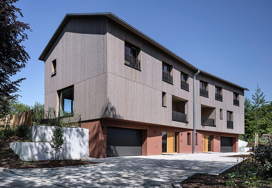 Langlebigkeit beim Bauen, generationenübergreifendes Denken, Klima- und Ressourcenschutz: Themen, zu denen Leipfinger-Bader in jedem Geschäftsbereich kontinuierlich forscht und das Produktportfolio entsprechend weiterentwickelt. Mittlerweile bietet das Unternehmen verschiedene energieeffiziente und nachhaltige Systemlösungen am Bau aus einer Hand an. Gleich mehrere Produkte kamen jetzt bei dem Bau eines Doppelhauses im niederbayerischen Thann zum Einsatz. Entstanden sind dort insgesamt zwei neue Wohneinheiten in Massivbauweise. Das Grundstück umfasst dabei eine Gesamtfläche von gut 950 m2. Die Geschossfläche beläuft sich auf rund 400 m2. Aufgrund der vorhandenen Grundstücksgeometrie entwarf das Architekturbüro feigel-dumps architekten aus Landshut einen schmalen, länglichen und abgewinkelten Baukörper. Das 3-geschossige Objekt verfügt zudem über ein hangseitig eingegrabenes Untergeschoss. In letzterem befinden sich unter anderem die Zufahrt, Garagen, Eingang, Garderobe, Gäste-WC und die Haustechnik. Erd- und Dachgeschoss werden als Wohnbereich genutzt und setzen sich durch Materialität und Fassadenvorsprung optisch deutlich vom Untergeschoss ab. So wurde in diesem gestalterischen Kontext eine Holzfassade vorgesetzt, während im unteren Geschoss eine braun-rote Putzfassade vorherrscht. Aus dem Wohn- und Essbereich im Erdgeschoss ist ein Zugang zu Terrasse und Garten möglich. Schlafräume und Bäder befinden sich im Dachgeschoss.