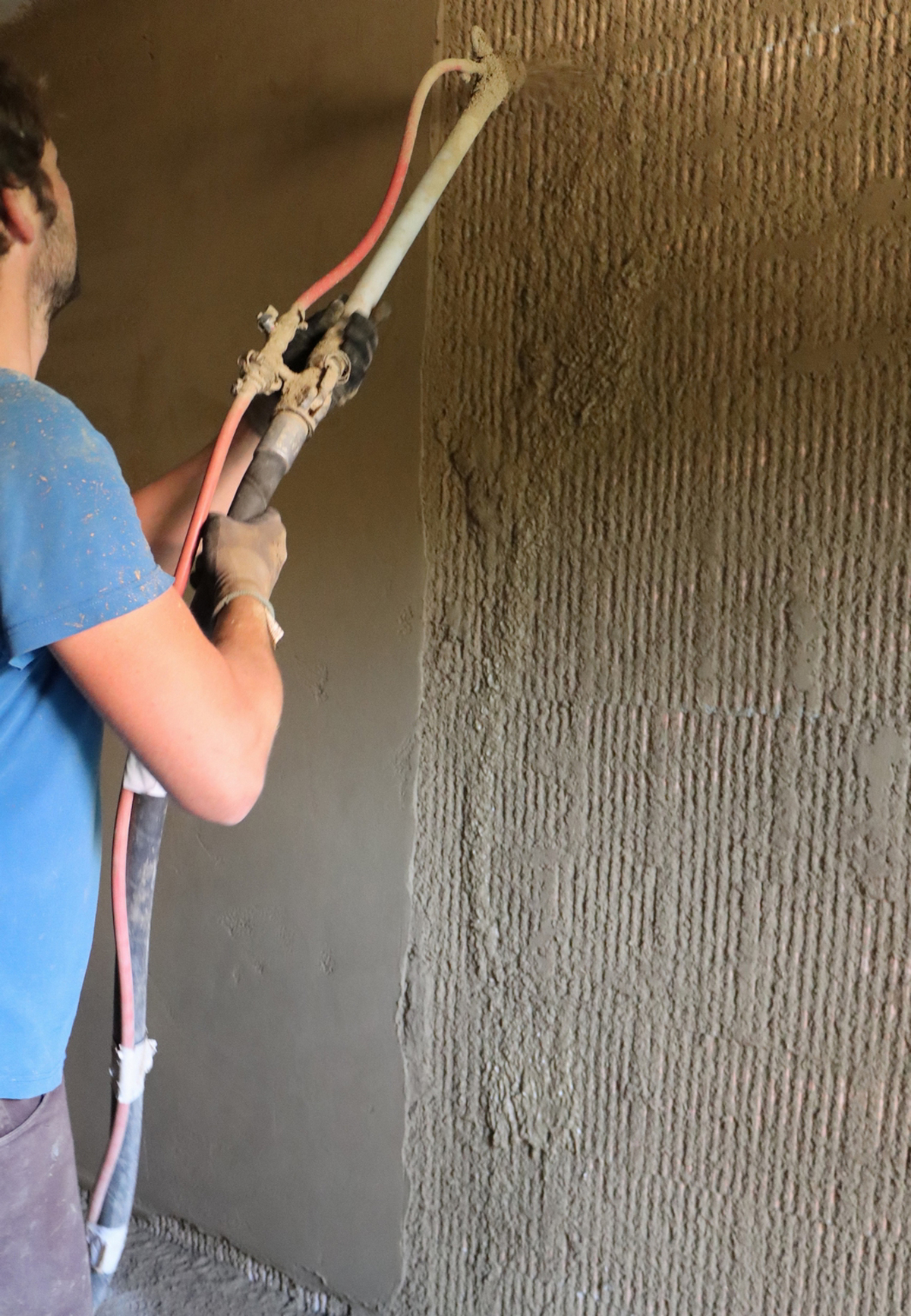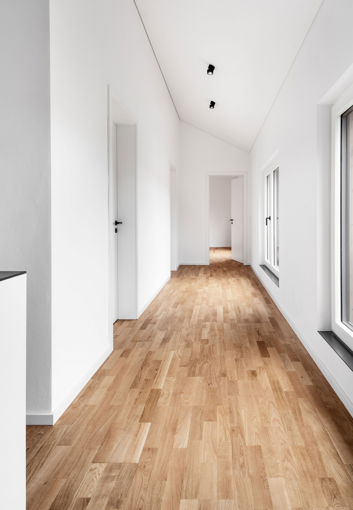 Der Gedanke, möglichst viele natürliche Materialien einzusetzen, wird auch im Bereich des Putzes konsequent fortgeführt. So wird hier auf einen Ober- und Unterputz aus Lehm gesetzt, dessen braune Farbe jedoch im Nachgang weiß überstrichen wurde, um modernes Erscheinungsbild und natürliches Raumklima gekonnt zu vereinen. Denn der Lehmputz reguliert die Feuchtigkeit im Raum, absorbiert Schadstoffe und kommt ohne künstliche Zusatzstoffe aus.