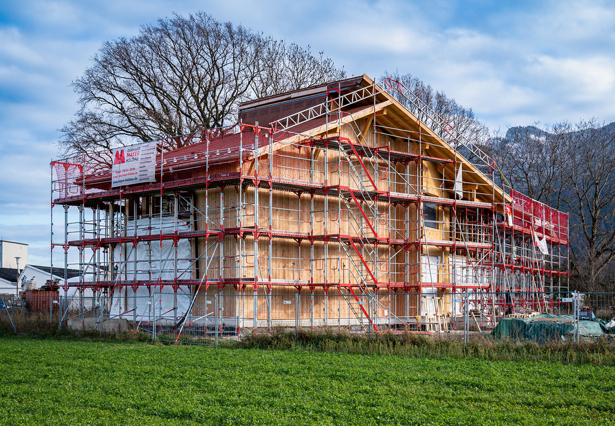 Die Rohbauarbeiten in Grassau sind bereits abgeschlossen. Die Fertigstellung der Kindertagesstätte ist für Pfingsten 2023 geplant.