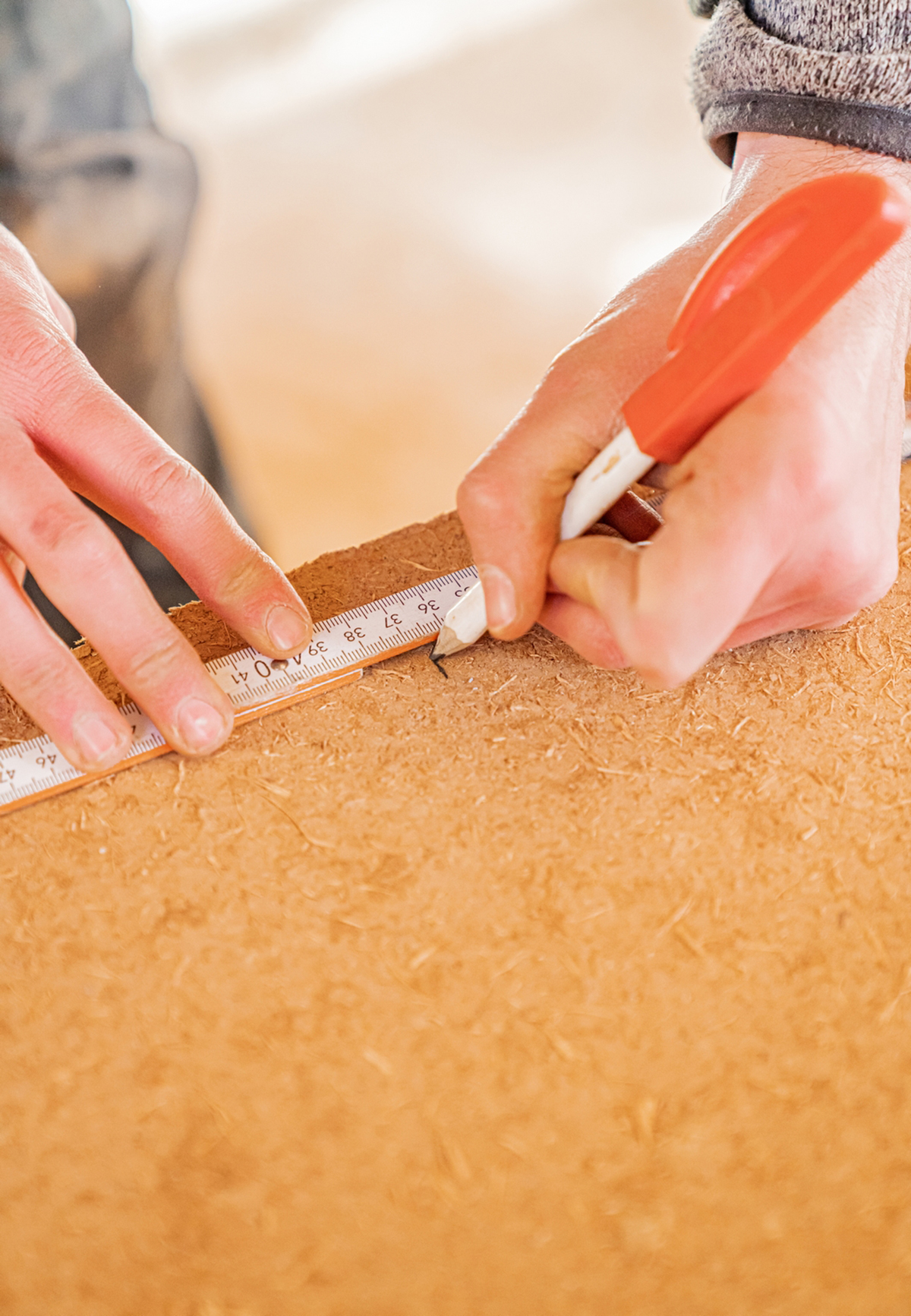 Die 16 Millimeter dicken Lehmplatten wurden vor dem Anbringen auf das erforderliche Maß zugeschnitten. Verschnittreste können als Putz zum Verfüllen von Schlitzen verwendet werden.