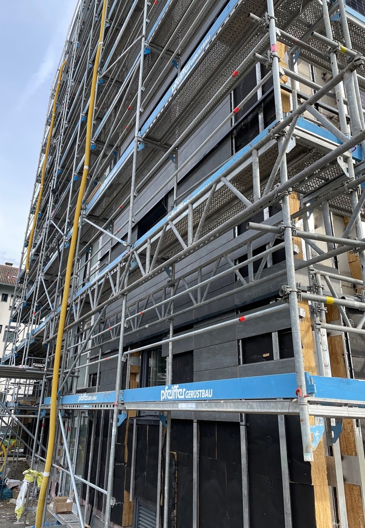 Auch die Fassade des Gebäudes wurde vollkommen umgestaltet und setzt die Modernisierung und Aufwertung im Inneren nach außen fort. Zudem fügt sich das Wohnheim trotz seiner Größe unauffällig in die bebaute Umgebung ein. Optisch auffällig an der Fassade ist das Wechselspiel zwischen den Photovoltaikmodulen und den Elementen der vorgehängten hinterlüfteten Fassade (VHF). Letztere stammt dabei aus dem Hause Leipfinger-Bader mit Tonality-Fassaden. Das Traditionsunternehmen ist spezialisiert auf vorgehängte hinterlüftete Keramikfassaden. Die Rohstoffe für die High-End-Keramik werden dabei regional im Westerwald gewonnen. Auch die Produktion erfolgt direkt vor Ort. Bei der Lindauer Sanierung fiel die Wahl aufgrund der besonderen Beschaffenheit des Untergrundes auf ein sehr leichtes Keramikelement. Während eine Dicke von 26 mm grundsätzlich als Standard gilt, kamen in Lindau Elemente mit einer Dicke von nur 22 Millimetern zum Einsatz. Tonality lieferte diese in zwei verschiedenen Formaten: 300 mal 1000 m und 300 mal 1200 m. Beide Größen wurden im Wechsel horizontal an der Fassade montiert.