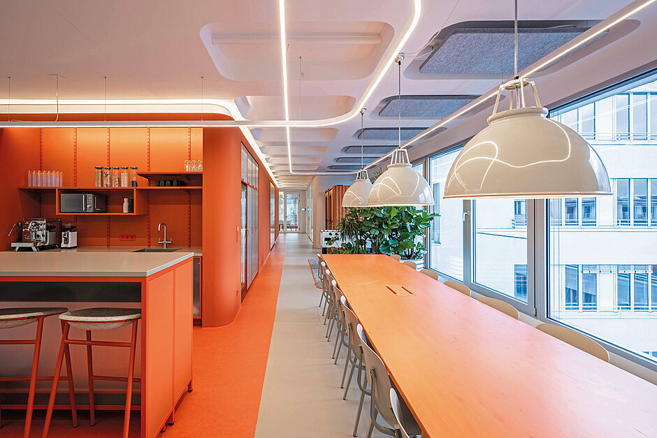 Die Absorber sind bereits in verschiedenen Bauvorhaben im Einsatz und wurden sowohl funktional als auch designtechnisch in die individuellen Raumaufgaben und Vorgaben integriert. In dem Büro- und Praxiszentrum »Hamburger Welle« kamen auf einer Mietfläche von 1 800 m² die Deckenabsorber »Mute+board« zum Einsatz. Diese sorgen nicht nur für bessere Akustik, sondern steigern in Kombination mit Lindner Loop Leuchten auch den visuellen Komfort in den neuen Büroflächen.