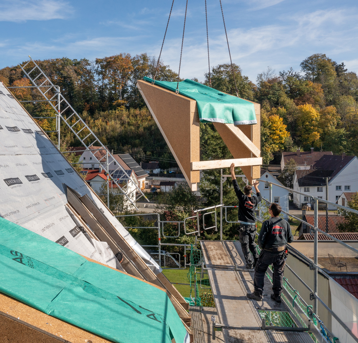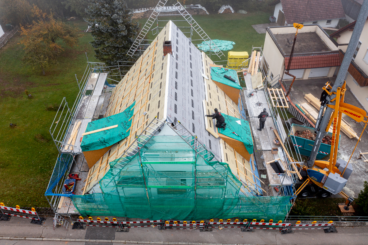 Für den hier vorgestellten Dachausbau in Ingoldingen beließ man es ebenfalls beim Handabbund. Bei dem Projekt handelte es sich um ein leer stehendes zweistöckiges Gebäude, das grundlegend renoviert und nach einem Dachausbau mit drei Mietwohnungen ausgestattet werden sollte.