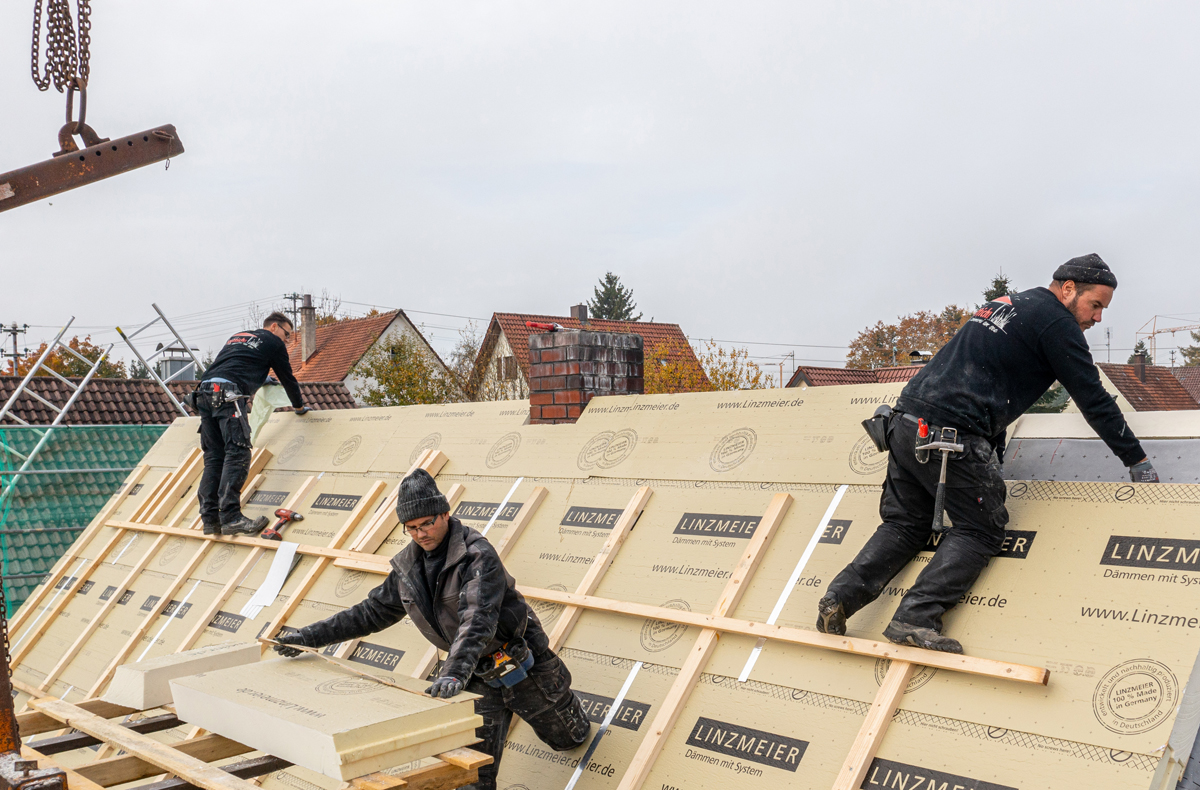 Nachdem die drei Gauben eingepasst wurden, montierten die Zimmerer die 160 mm starken Dämmelemente von unten nach oben.