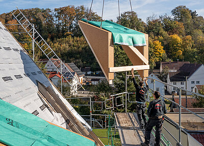 Querstöße (stumpf geschnitten) ergeben sich in der Regel nur an den Giebelseiten. Die Kantenverbindung auf der Längsseite erfolgt durch die bewährte Nut-und-Feder-Verbindung. Eine 10 cm überlappende, diffusionsoffene und beidseitig TPU-beschichtete Premium-Unterdeckbahn sorgt gemäß dem aktuellen ZVDH-Regelwerk mit Zusatzmaßnahmen für ein Klasse-1-Unterdach mit UD-Abdeckstreifen über der Konterlatte bzw. ein Klasse-2-Unterdach in Verbindung mit Nageldichtung unter der Konterlatte.