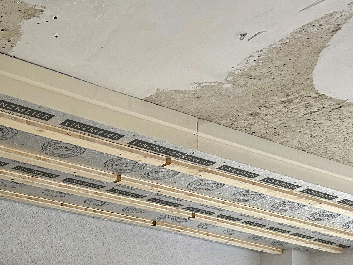 Bei der Montage an Wand und Decke wird das Produkt vollflächig oder per Randwulst-Punkt-Verfahren mit dem Untergrund verklebt und zusätzlich durch die Lattung verschraubt. Bei der Montage am Sparren ist eine Luftdichtigkeitsschicht zwischen Dämmung und Dachkonstruktion erforderlich. Falls nicht schon vorhanden, lässt sie sich schnell und zuverlässig mit der zum System gehörenden Abdichtungsbahn »Linitherm L+D Pro« herstellen. Auch hier präsentiert Linzmeier mit der Luftdichtheitsbahn »Linitherm Loop L+D« eine neue ökologische Alternative.