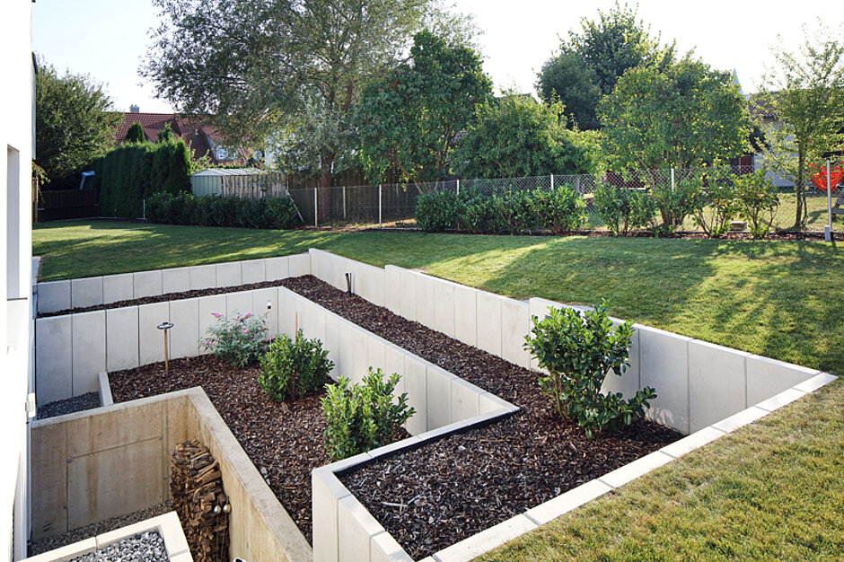 Gefertigt aus Sichtbeton der Klasse 4 fügen sich »L-Tec«-Winkel nahtlos in die Umgebung ein. Auch eine erweiterte Anwendung als beidseitig sichtbar belassene Wand oder als Sichtschutz bietet sich an. Mit der Expositionsklasse XF4 sind sie selbst im unmittelbaren Straßenbereich einsetzbar, da widerstandsfähig gegen Frost und Frosttausalz.
