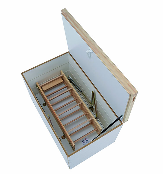 Der patentierte WDL besteht aus zwei Komponenten, einer Folie mit variablen sd-Werten und einem Kompriband. Über die Folie, die außen am Lukenkasten angebracht ist, wird die in der Baufuge vorhandene Feuchtigkeit abtransportiert, ohne dass neue Feuchtigkeit in die Fuge eindringen kann. Durch das Kompriband wird der notwendige Druck zwischen Bodentreppe und Bauwerk aufgebaut. »Der Vorteil gegenüber dem bisher eingesetzten PU-Schaum ist die Dauerelastizität des Bands. Damit können Bauwerksbewegungen sehr gut kompensiert werden, während die Dichtigkeit erhalten bleibt«, so Heim weiter. Auch Wärmebrücken werden vermieden. Der Sandwichdeckel mit geschäumtem PU-Dämmmaterial sorgt für zusätzliche Energieeffizienz bei vergleichsweise geringem Gewicht.