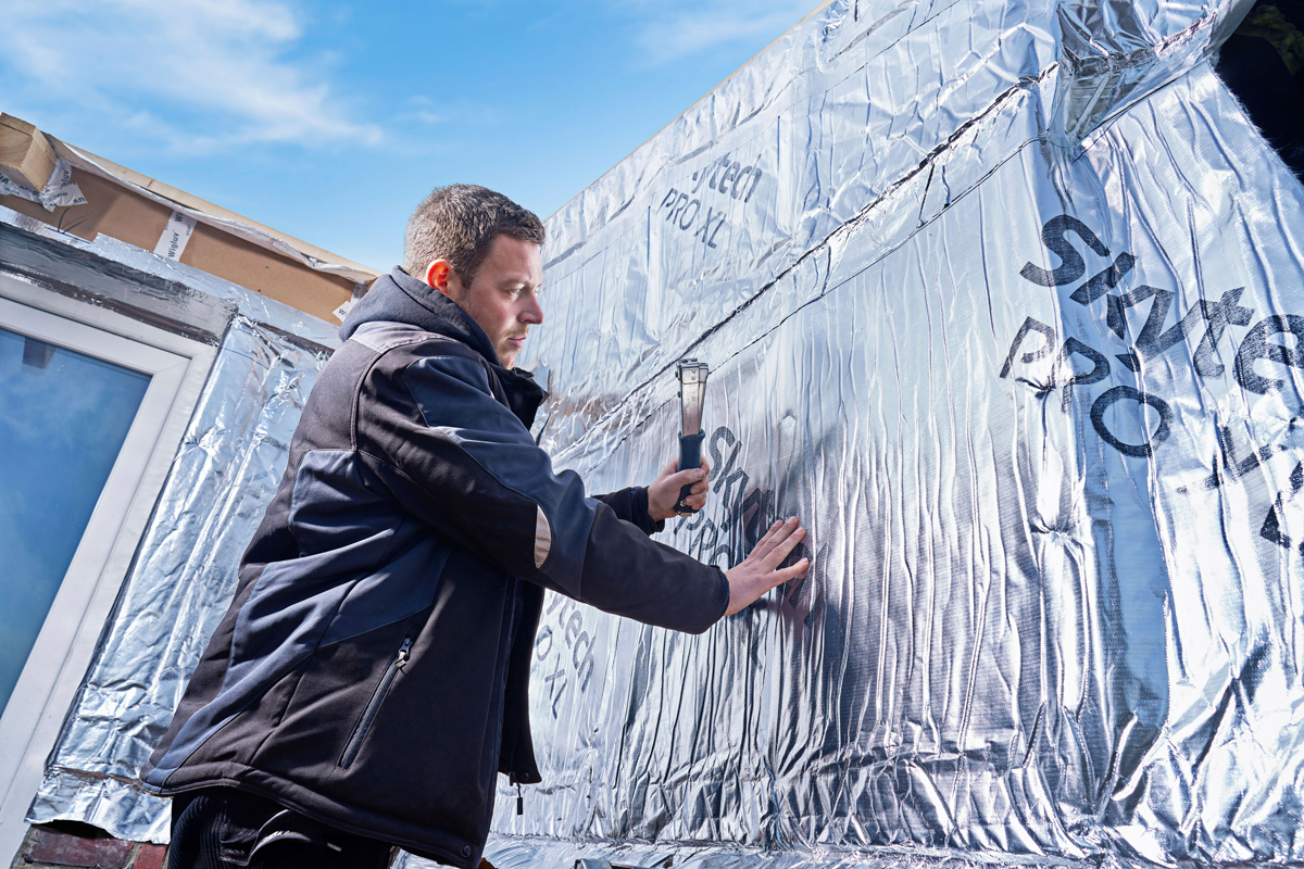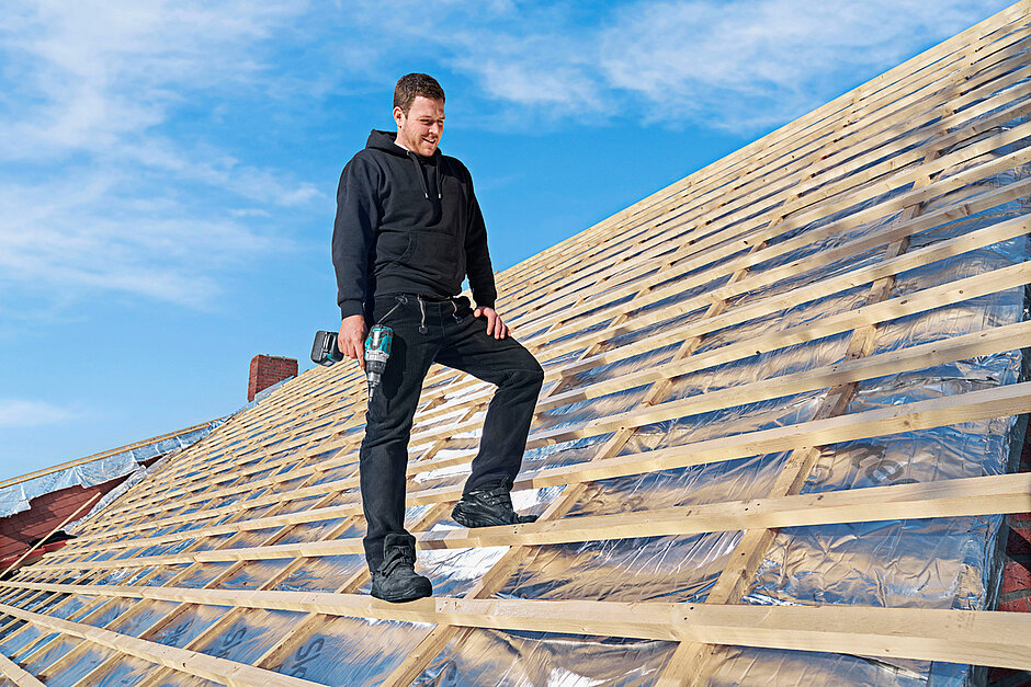 Mit einer Dicke von nur 13 mm verbessert »Skytech Pro XL« den Dämmwert der gesamten Konstruktion, ohne diese zusätzlich zu erhöhen. Gleichzeitig wird auch der Schallschutz um bis zu -16 dB erhöht. Gemäß EN 13501-1 ist die multifunktionale Unterdeckbahn nicht brennbar A2-s1, d0 und verzögert das Übergreifen von Feuer in das Gebäude. Auch darf sie direkt an Kaminen und über Brandwände hinweg verlegt werden. Dabei ist die 1,12 m breite Bahn auch dank eines integrierten Klebestreifens im Überlappungsbereich einfach und schnell zu verlegen. Nicht zuletzt lässt sich die »Skytech Pro XL« mit baustellenüblichen Werkzeugen zuschneiden und befestigen. Aufgrund ihrer