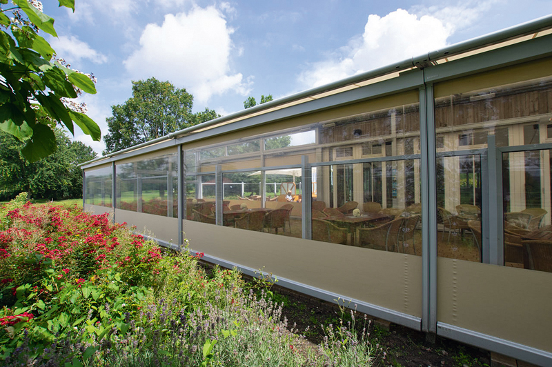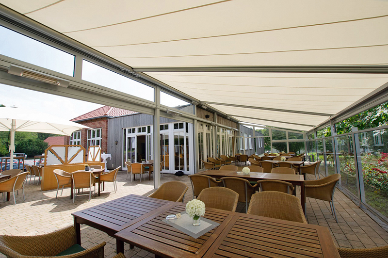 Auch der Golfclub »Schloss Vornholz« in Enningerloh-Ostenfelde, im westfälischen Münsterland, entschloss sich für ein vergleichbares Anlagensystem von markilux. Die Kombination aus »pergola« und »syncra« beschattet hier eine Fläche von gut 100 m2. Integrierte Vertikalmarkisen mit Panoramafenster bieten auf über 17 m Länge zusätzlichen Windschutz, wobei sie einen freien Blick auf die Parklandschaft des Golfplatzes gewähren. »Durch die Ausstattung mit Wärmestrahlern können Gäste den Außensitzplatz fast das ganze Jahr über nutzen. Und die LED-Lichtleisten sorgen dazu für eine schöne Atmosphäre. Die Anlagen böten zudem bei Turnieren den Vorteil, dass Siegerehrungen auch bei regnerischem Wetter möglich seien und sich die Außenflächen ebenso für private Veranstaltungen besser nutzen ließen. »Hinzu kommt, dass die Sommer in den vergangenen Jahren heißer geworden sind. Viele Menschen verbringen ihre Freizeit dennoch am liebsten draußen. Wer als Clubbetreiber oder Gastronom seinen Gästen auf einer Terrasse den nötigen Komfort bieten möchte, der schafft einen großzügigen Schattenraum, in dem man sich gerne und lange aufhält«, weiß Jan Kattenbeck. J