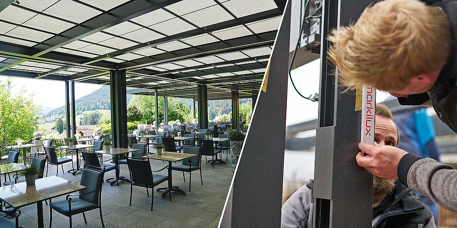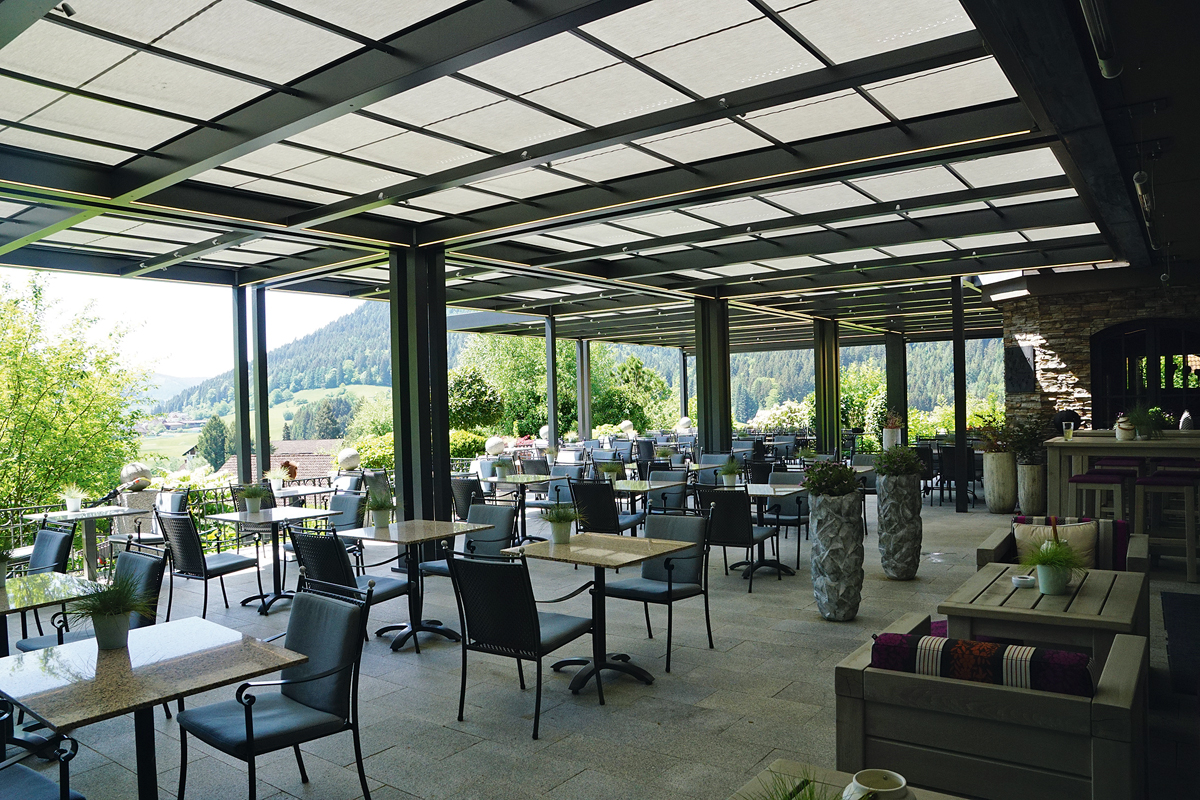 Die Außenterrasse des Wellnesshotels Heselbacher Hof in Baiersbronn (Schwarzwald) erhielt ein großzügiges Markisendach der Marke Markilux. Bei der Montage unterstützte Markilux den ausführenden Fachbetrieb mit eigenen Servicetechnikern.