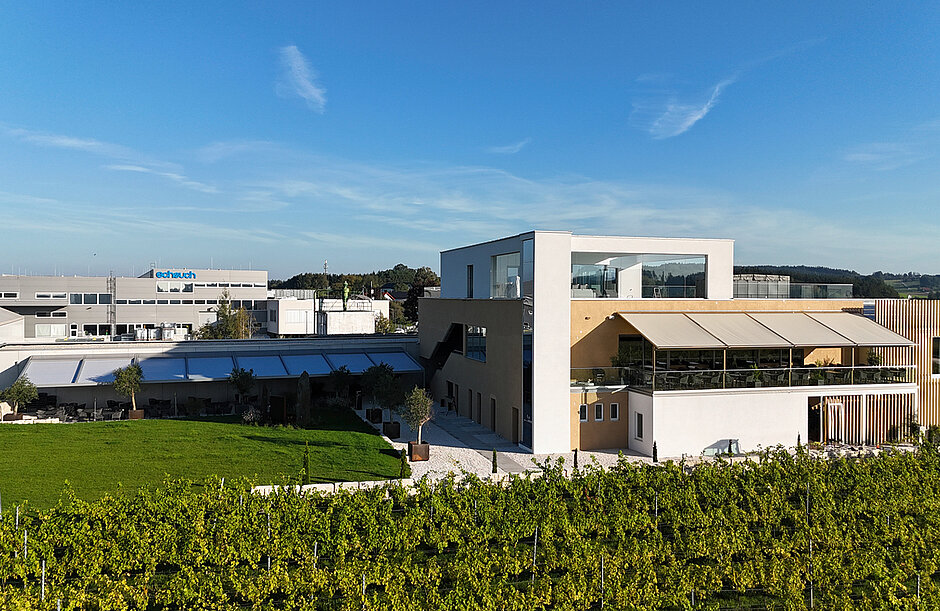 Auf dem noch jungen Weingut im Innkreis bauen Christian Pumberger und sein Kellermeister Christian Größlbauer seit 2019 Weißwein an. Den verköstigen die Winzer nun bereits im dritten Jahr im Restaurant des »Weinwerks«, einer Eventlocation für Hochzeiten und Firmenveranstaltungen. Das Geschäftskonzept, zu dem eine Schaukellerei sowie Weinführungen im großen Stil gehören, erwies sich mit seinen stetig wachsenden Besucherzahlen als sehr erfolgreich. Daher entschied sich Eigentümer Christian Pumberger dazu, die Außengastronomie seines modernen Betriebs durch Markisen von Hersteller Markilux wettersicher zu gestalten.