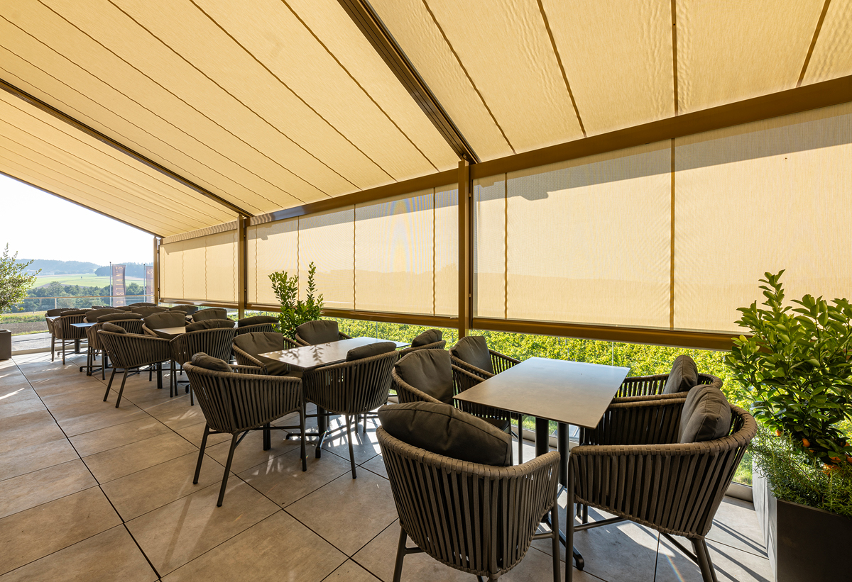 Die beiden fast 290 m² messenden Terrassen mit Blick in den Weingarten habe ein Fachpartner aus der Region mit zwei verschiedenen Modellen von Markilux ausgestattet. Und zwar mit vier »Pergola Stretch«-Anlagen, die besonders große Flächen beschatten können, sowie mit vier »Pergola Classic«-Systemen. Diese erhielten durch integrierte Vertikalmarkisen einen zusätzlichen Blend- und Windschutz, erklärt der Fachmann.