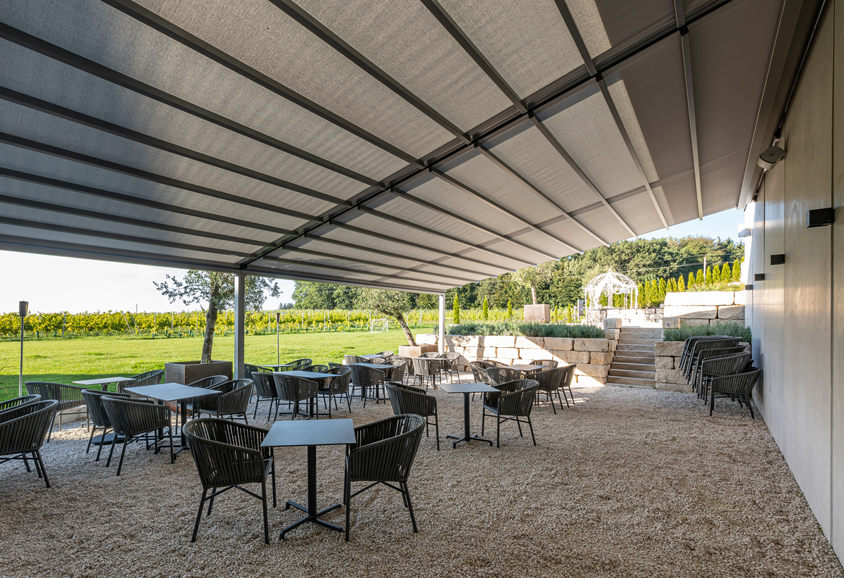 »Das Weingut rechnet mit wachsenden Besucherzahlen und hierauf muss auch die Außengastronomie eingestellt sein«, erklärt Jan Kattenbeck, Leiter von Markilux Project, einem Team, das für das Objektgeschäft des Markisenspezialisten verantwortlich ist. Die Location »Weinwerk« biete drinnen und draußen genügend Raum. Doch es sei notwendig gewesen, die beiden Außenterrassen mit ihren 150 Sitzplätzen durch großzügige Markisensysteme vor Sonne und Regen zu schützen.