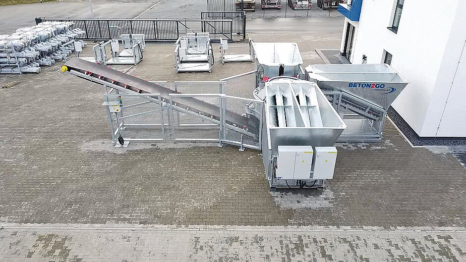 Die Betontankstelle mit großem Mischer und sechs Kammern ist ab sofort erhältlich. Auf Wunsch kann auch ein breiteres Förderband geordert werden, mit dem sich der Mischer schneller entladen lässt.