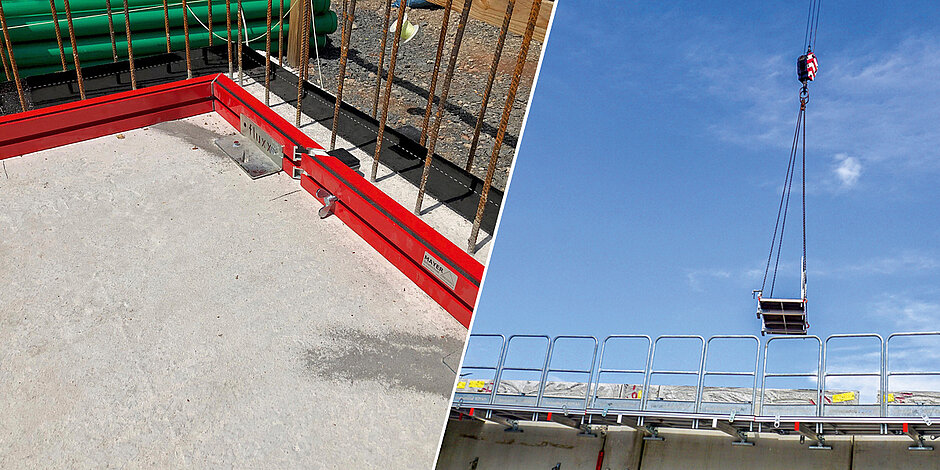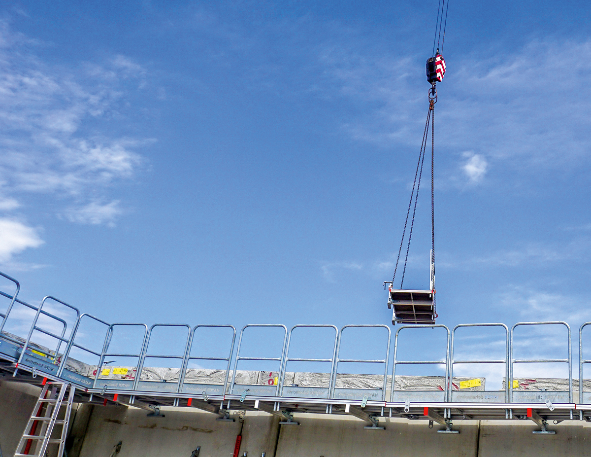 Besonders gespannt war man bei der Firma Loosen auf den Jungferneinsatz der neuen Betonierbühne »sigeMAX«. Die knapp 50 Kilogramm leichte Plattform für komfortable Betoniervorgänge auf höchstem Sicherheitsniveau konnte all ihre Trümpfe in Zündorf ausspielen. Besonders auffallend erwies sich die universale Einsatzmöglichkeit, sowohl an den Hohlwänden als auch an der »ultraMAX L«-Rahmenschalung. Dank modifizierbarer Einhängeköpfe ist es möglich, die »sigeMAX« an jedem gängigen Rahmenschalungssystem zu installieren. »Die Betoniervorgänge mit der ›sigeMAX‹ an den Hohlwänden und der hinzugemieteten ›ultraMAX L‹-Schalung gestalteten sich zügig, unkompliziert und für unsere Arbeitskräfte, verglichen mit ähnlichen Konsolen und Bühnen, extrem komfortabel, da die Trittfläche sehr breit und rutschfest ist. Dass wir die Bühne außerdem bei Bedarf an unserer alten Bestandsschalung nutzen können, macht das Ganze natürlich noch bemerkenswerter«, erklärte ein sichtlich zufriedener Guido Loosen.