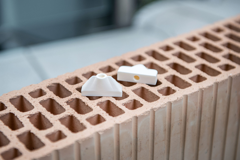 Der Ablauf des eigentlichen Herstellungsprozesses der Ziegel bleibt unverändert. Da das Rohmaterial, ein Gemisch aus tonhaltigem Lehm, mit enormem Druck durch das Presswerkzeug am Ausgang der Strangpresse gepresst wird, müssen die gedruckten Einsätze hohe Anforderungen erfüllen. Hinzu kommt, dass die keramische Ziegelmasse permanent an den Presswerkzeugeinsätzen vorbeiströmt und stark abrasiv auf alle Komponenten wirkt. Nach unterschiedlichen Versuchen mit dem gemeinsamen Projektpartner Hilgenberg-Ceramics GmbH & Co. KG, Spezialist für industrielle 3DDruck-Technologien, setzt Mein Ziegelhaus auf Einsätze aus hochreinem Aluminiumoxid. Deren Festigkeit ist mit der Härte eines Saphirs vergleichbar. So können sie dem Abrieb deutlich länger widerstehen und haben dadurch eine deutlich höhere Standzeit als Stahl.