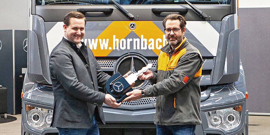 Die Hornbach Baumarkt AG setzt auf den batterieelektrischen eActros für den schweren Verteilerverkehr. Bei einer feierlichen Übergabe in Wörth am Rhein hat Dominik Hehl, Verkaufsleiter für Mannheim, Heidelberg und Landau bei Mercedes-Benz Lkw, einen eActros 300 als Zweiachser persönlich an Ingo Leiner, Mitglied des Vorstands der Hornbach Baumarkt AG, übergeben. Der in Bornheim (Pfalz) ansässige Betreiber von Bau- und Gartenmärkten will den eActros für den Transport von Bestellungen direkt zum Kunden nach Hause bzw. auf die Baustelle einsetzen.