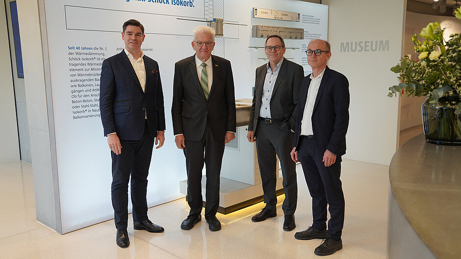 »Das Thema Bauen ist für die Landesregierung von großer Bedeutung. Daher haben wir 2022 den Strategiedialog ›Bezahlbares und innovatives Bauen‹ gestartet. Besonders die Beschleunigung von Bauvorhaben liegt uns dabei am Herzen. Diese erreichen wir durch Digitalisierung und Bürokratieabbau«, so Ministerpräsident Kretschmann. »Der Bausektor ist außerdem ein bedeutender Faktor für den Klimaschutz. Nachhaltige Neubauten sind dafür ebenso erforderlich wie ein kluger Umgang mit dem Bestand. Und hier vor Ort bei der Firma Schöck werden spannende Lösungen für energieeffizientes Bauen made in Baden-Württemberg erarbeitet, insbesondere für die Wärmedämmung.«