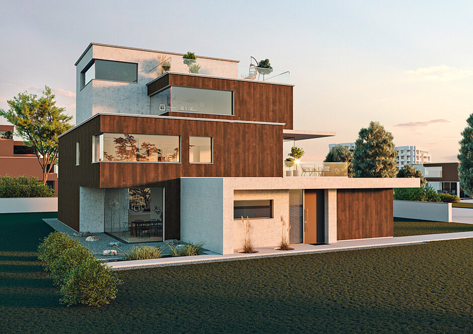 Rost-Optik ist aktuell angesagt, diesen Gestaltungstrend hat Mocopinus in die Designauswahl seiner Profilhölzer aufgenommen. Die Variante »Corline20« vereint den ökologischen Rohstoff Holz mit einem industriellen Design zur modernen Fassadenverkleidung. Die Hölzer mit ihren in rotbraun schimmernden Oberflächen in Rosttönen lassen sich dabei auch gut mit anderen Materialien kombinieren. Im Kontrast zu Stein, Beton, Metall oder Glas entsteht ein spannungsreiches Fassadendesign.