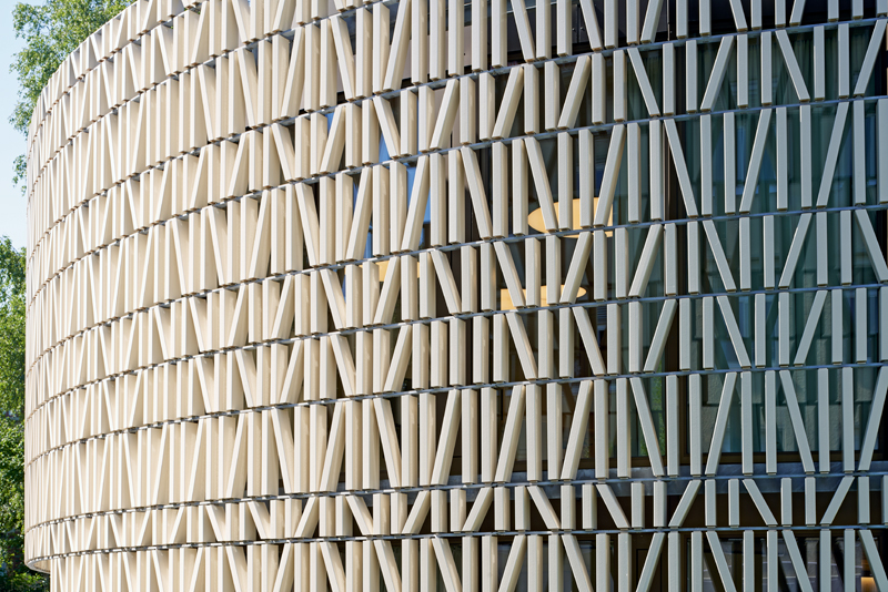 Realisiert wurde diese semitransparente Gebäudehülle mithilfe der insgesamt 7 714 länglichen Keramikbaguettes in der Größe 120 x 60 cm. Ihr rechteckiges Format, die vertikale und schräge Anordnung, sowie das gebrochene Weiß und die pergamentartige Struktur rekonstruieren dabei das Format und die Schrift eines Buches. Zur Befestigung dienen spezielle Tragprofile auf einer systemspezifisch, gebogenen Stahlunterkonstruktion, die eine schnelle und einfache Montage und einen späteren Austausch rund um das Gebäude ermöglichen.