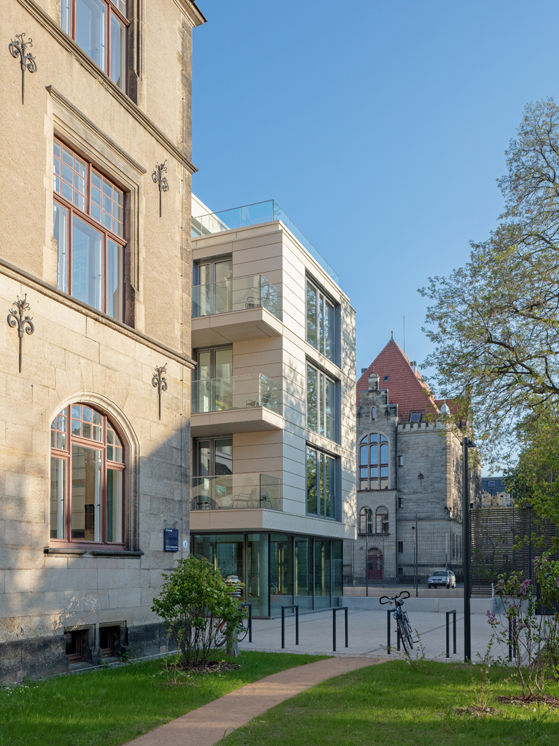 Wie elegant sich eine hinterlüftete Keramikfassade von Moeding in eine gewachsene Baulandschaft aus umliegenden Gründerzeitvillen integrieren lässt, zeigt das Alumnat – ein mit der Lehranstalt verbundenes Schülerwohnheim auf dem Campus des Evangelischen Kreuzgymnasiums in Dresden-Striesen.