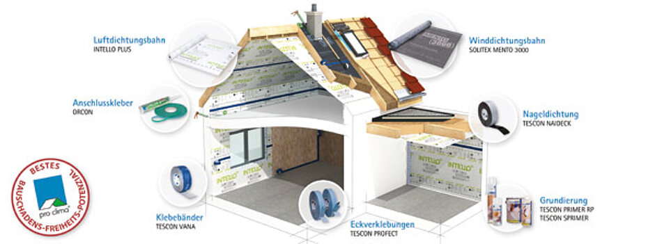 Das Kernsystem besteht aus der feuchtevariablen Dampfbremsbahn »Intello Plus«, der Unterdeck- und Unterspannbahn »Solitex Mento 3000« drei verschiedenen Klebemitteln, einem Nageldichtband und einer Grundierung. Den Produkten gemeinsam ist, dass man sie in einer Vielzahl von Konstruktionen und Anwendungsfällen einsetzen kann, ohne Abstriche bei ihrer Funktionstüchtigkeit oder einfachen Verarbeitbarkeit befürchten zu müssen.