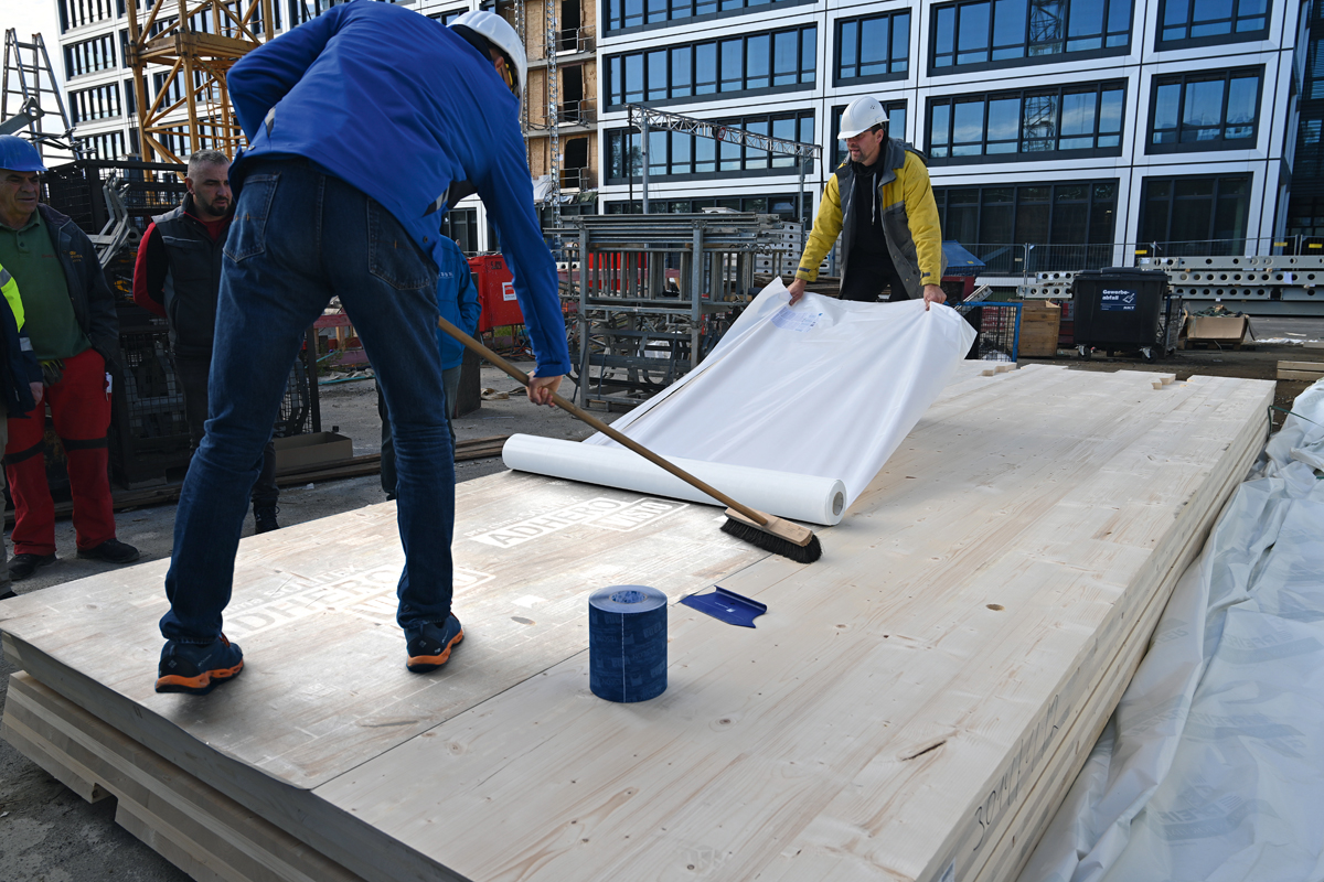Wichtige Details bleiben im Baufortschritt also sichtbar. Gleichzeitig werden die hochwertigen Holzbauelemente geschützt, gerade wenn diese unterseitig in Sichtqualität erhalten werden müssen. Hier einmal aufgetretene Wasserläufer sind erhebliche optische Beeinträchtigungen und nur noch mit großem Aufwand zu entfernen.