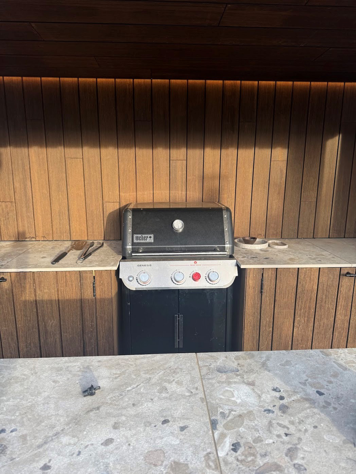 Die Familie hatte sich beim Bau der Terrasse für Terrassendielen des Bambusspezialisten Moso entschieden. Die Verkleidung der Außenküche wurde dann mit Fassadenelementen aus dem gleichen Material weitergeführt. Beide Produkte stammen aus der Serie »Bamboo X-treme« des niederländischen Herstellers. Um die Härte, Formstabilität und Dauerhaftigkeit dieser Bambuselemente auf ein Niveau zu heben, das weit über den besten tropischen Hartholz-Arten liegt, setzen die Spezialisten von Moso innovative Herstellungsverfahren ein.