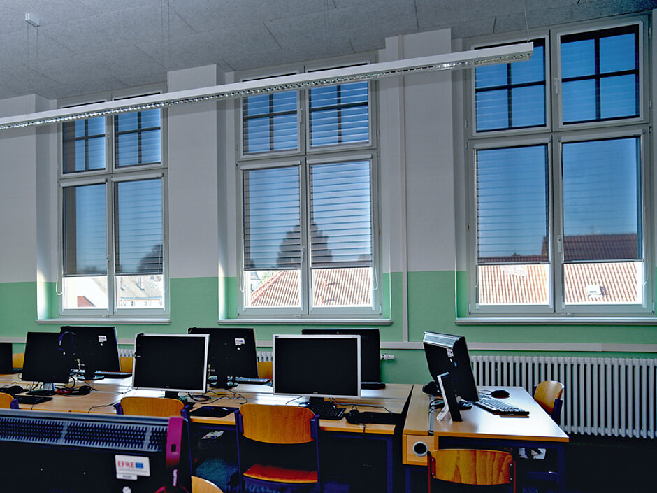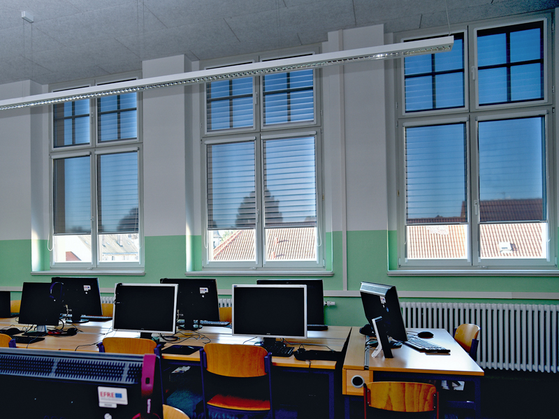 Die nach außen zeigende Aluminiumbeschichtung reflektiert einen Großteil der Sonnenstrahlen, schützt effektiv vor sommerlicher Hitze und verbessert im Winter die Dämmung der Fenster. Das Raumklima wird damit ganzjährig verbessert. Die Rollos können nach Bedarf individuell per Kettenzug bedient werden, erlauben freie Aussicht und lassen Tageslicht in den Raum. So behalten Schüler und Lehrer den Durchblick, einen kühlen Kopf und lassen sich nicht blenden. Selbst den Hausmeister freut es – mit robuster Ausführung sind die Rollos laut Hersteller wartungsfrei und zuverlässig. J