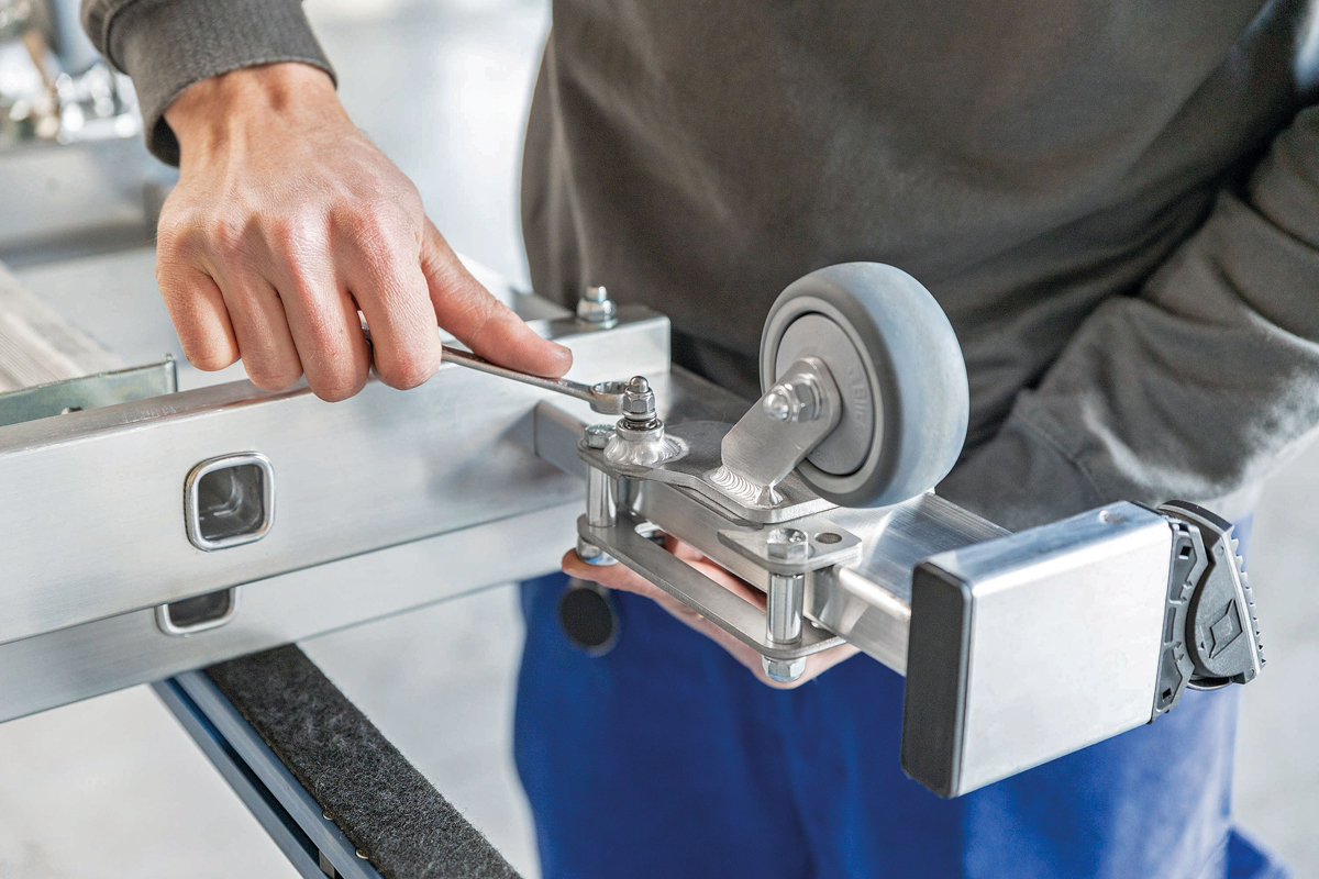 Ihre Ergonomie-Innovationen entwickelt Munk in enger Abstimmung mit Betriebsärzten und Arbeitssicherheitsbeauftragten. Die Entwickler reagieren dabei stets auch auf die aktuellen Herausforderungen, wie die Ausweitung der »roll-bar«-Funktionalität auf das Stufenleiter-Sortiment zeigt. Zudem wird das Angebot laufend verbessert: So lassen sich die Rollen beispielsweise mit dem Fuß in Position bringen, so dass sich niemand bücken muss.