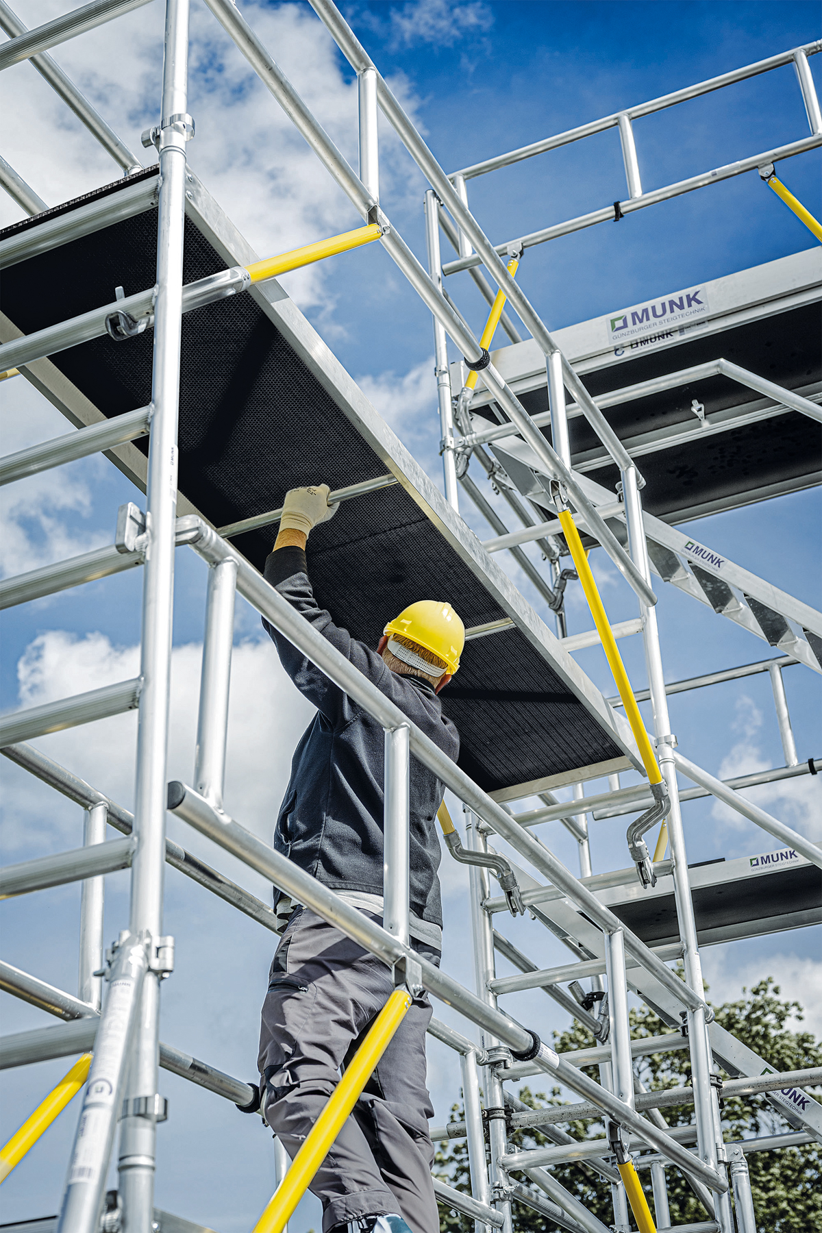 Das gilt auch für die neue »Ergo-Plattform« der Munk Günzburger Steigtechnik. Die Produktinnovation besteht aus einem Kompositwerkstoff und ist somit deutlich leichter als herkömmliche Rollgerüst-Plattformen. Durch ihr geringes Gewicht reduziert sie die Belastung der Arbeitskräfte beim Auf-, Um- und Abbau merklich. Zwei Griffschienen sorgen für zusätzliche Stabilität und erleichtern ebenfalls das Handling. Das Ergebnis: Eine besonders ergonomische Plattform, die höchsten Sicherheitsstandards entspricht. Die neue Ergo-Plattform der Munk Günzburger Steigtechnik ist für sämtliche Rollgerüst-Aufbauten mit Gerüstlängen von bis zu drei Metern geeignet und entweder mit oder ohne Durchstiegs-Klappe erhältlich.